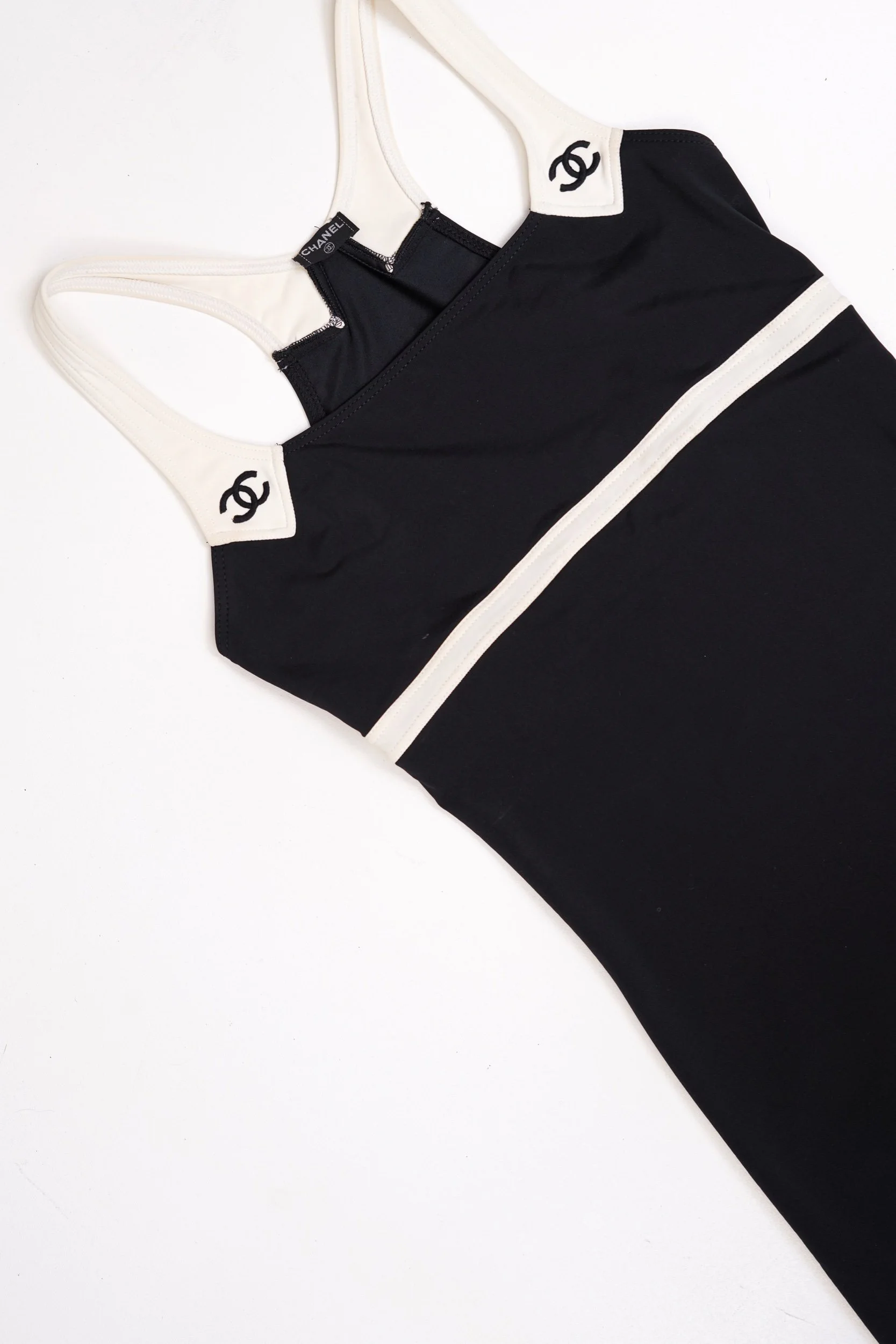 From the 1996 collection, this exquisite Chanel dress embodies the house’s timeless sophistication and minimalist allure. Crafted in sleek black fabric with contrast ivory trim, it features the iconic interlocking CC logos embroidered at the straps. The square neckline, fitted bodice, and subtly flared midi-length skirt create a refined, feminine silhouette that reflects Chanel’s signature elegance of the 1990s era.