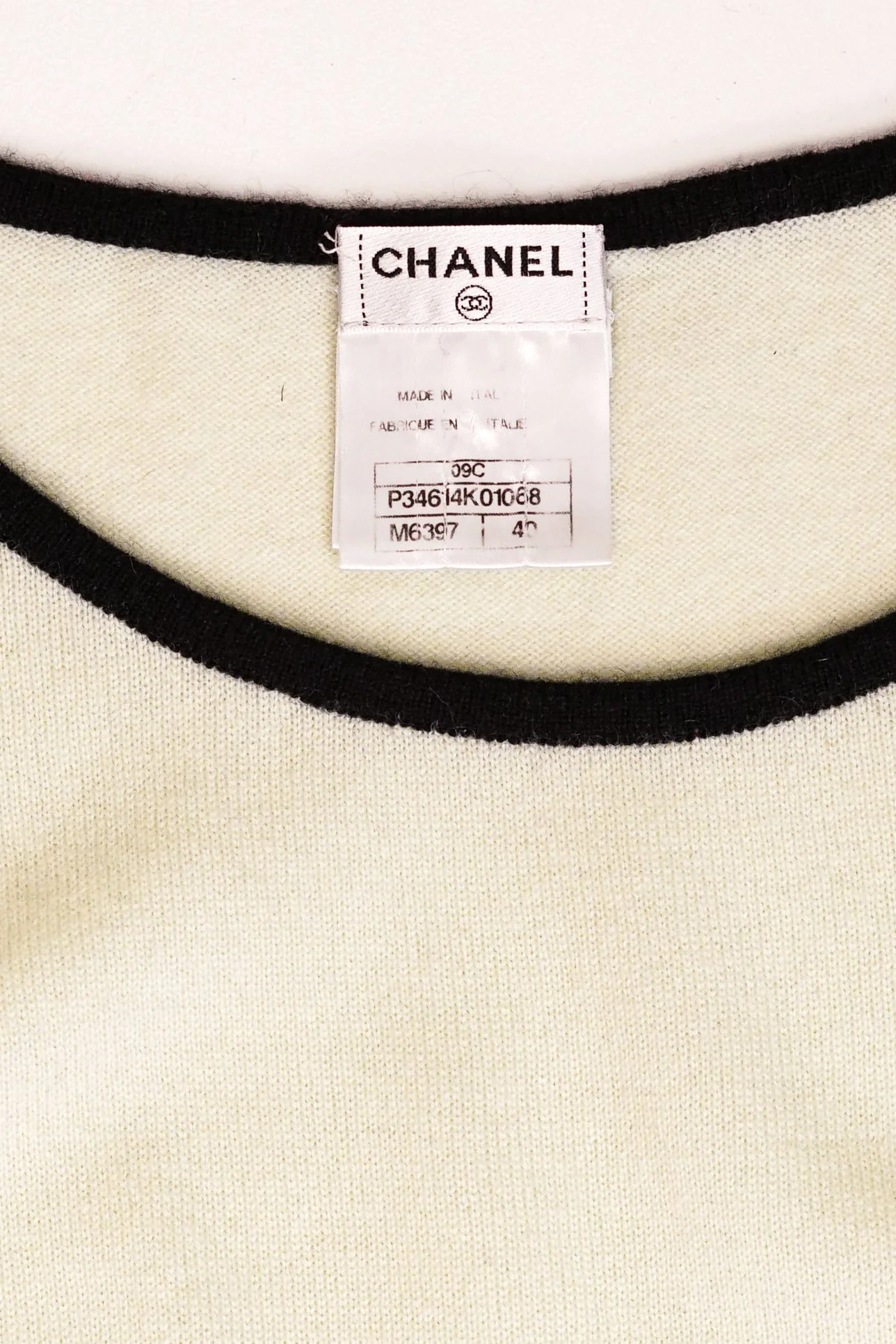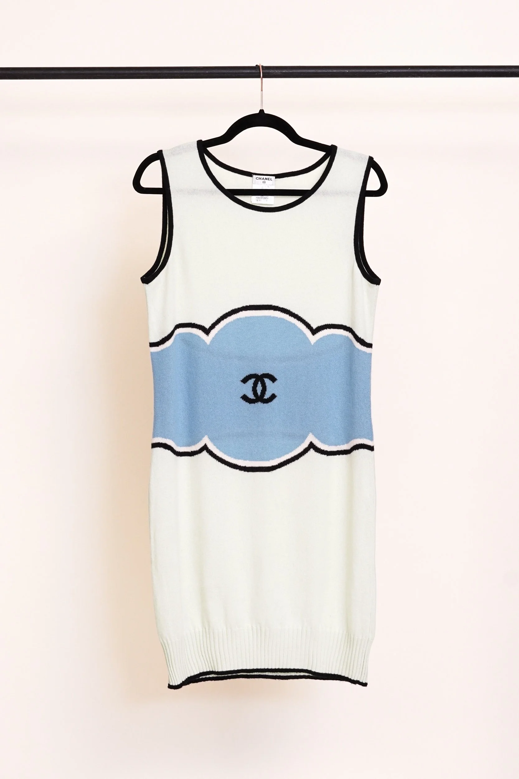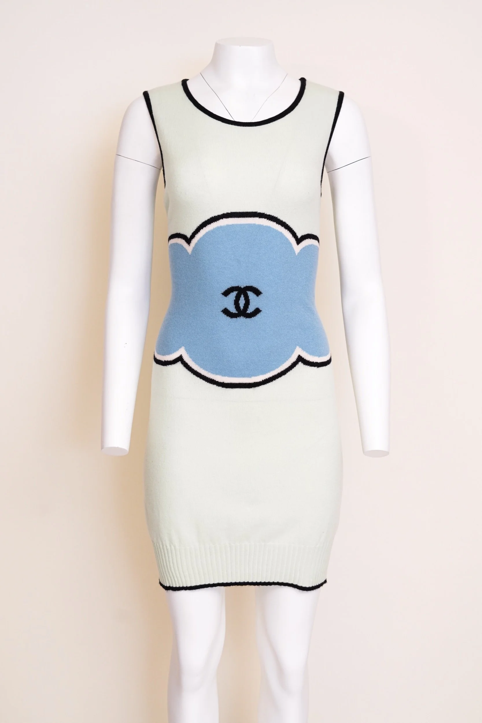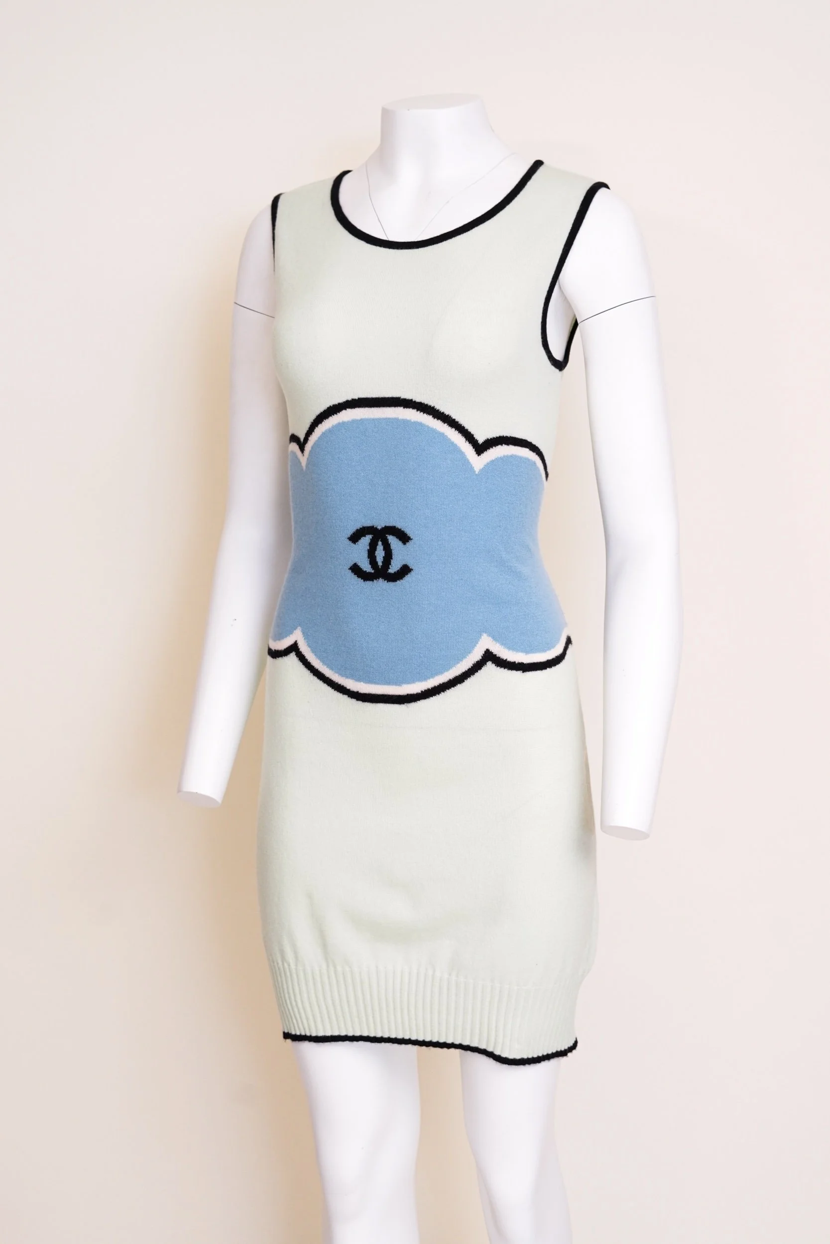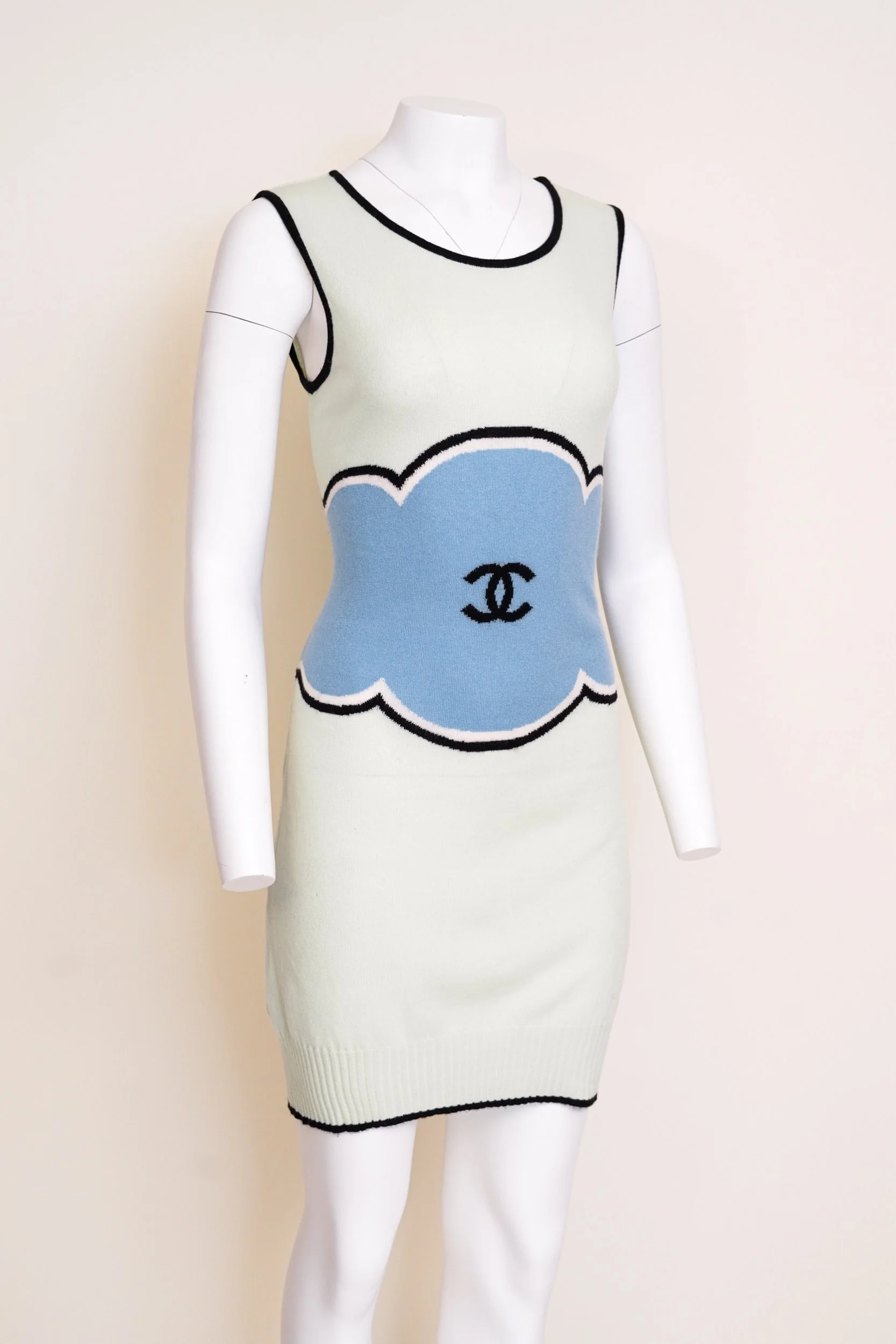 From the 2009 Cruise collection, this rare Chanel mini dress embodies playful sophistication. Crafted in soft mint green cashmere with contrast black trim, it features a striking blue cloud-shaped panel across the waist, adorned with the iconic interlocking CC logo at the center. The sleeveless silhouette and body-skimming fit make it a versatile piece that transitions effortlessly from resort wear to chic city styling.