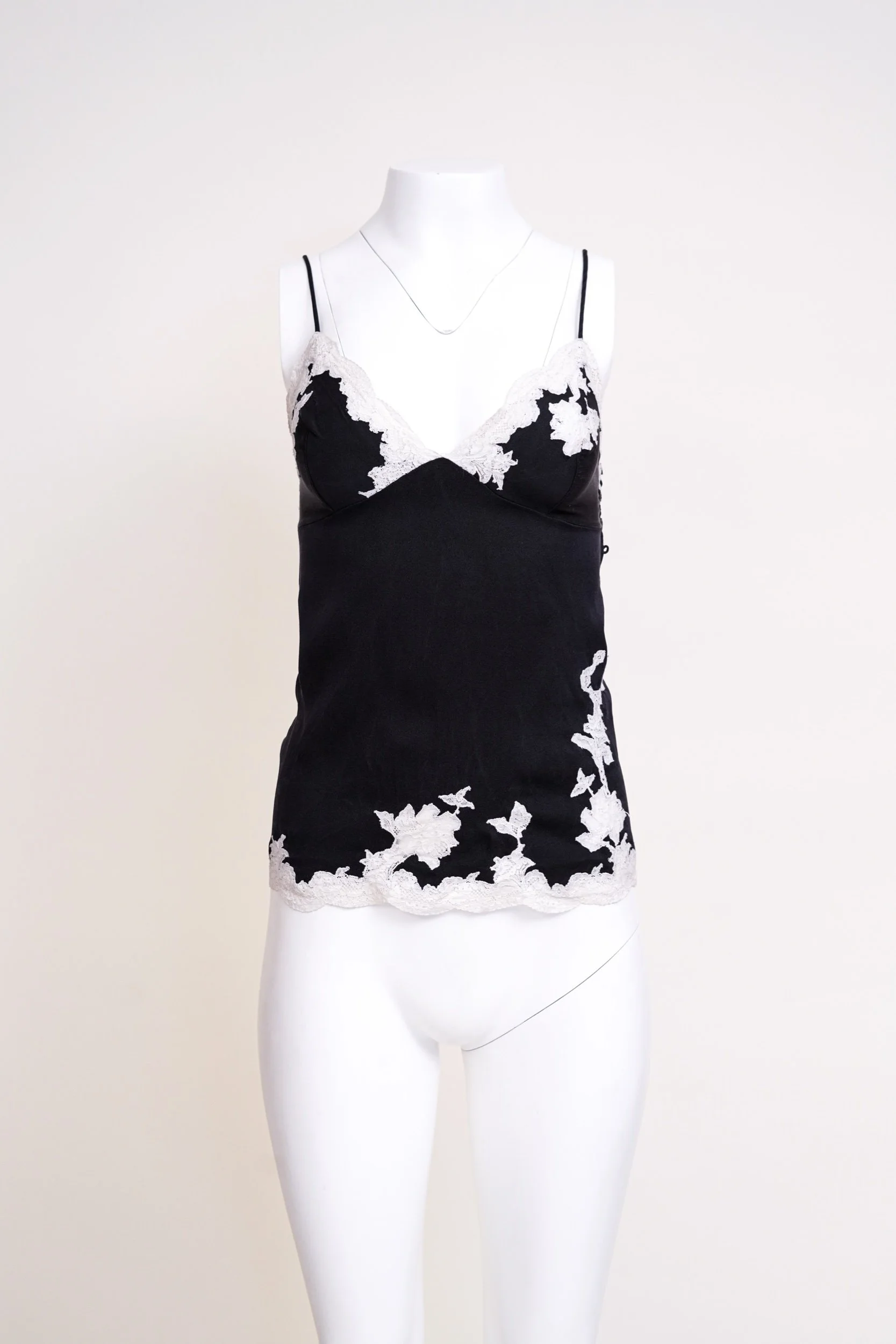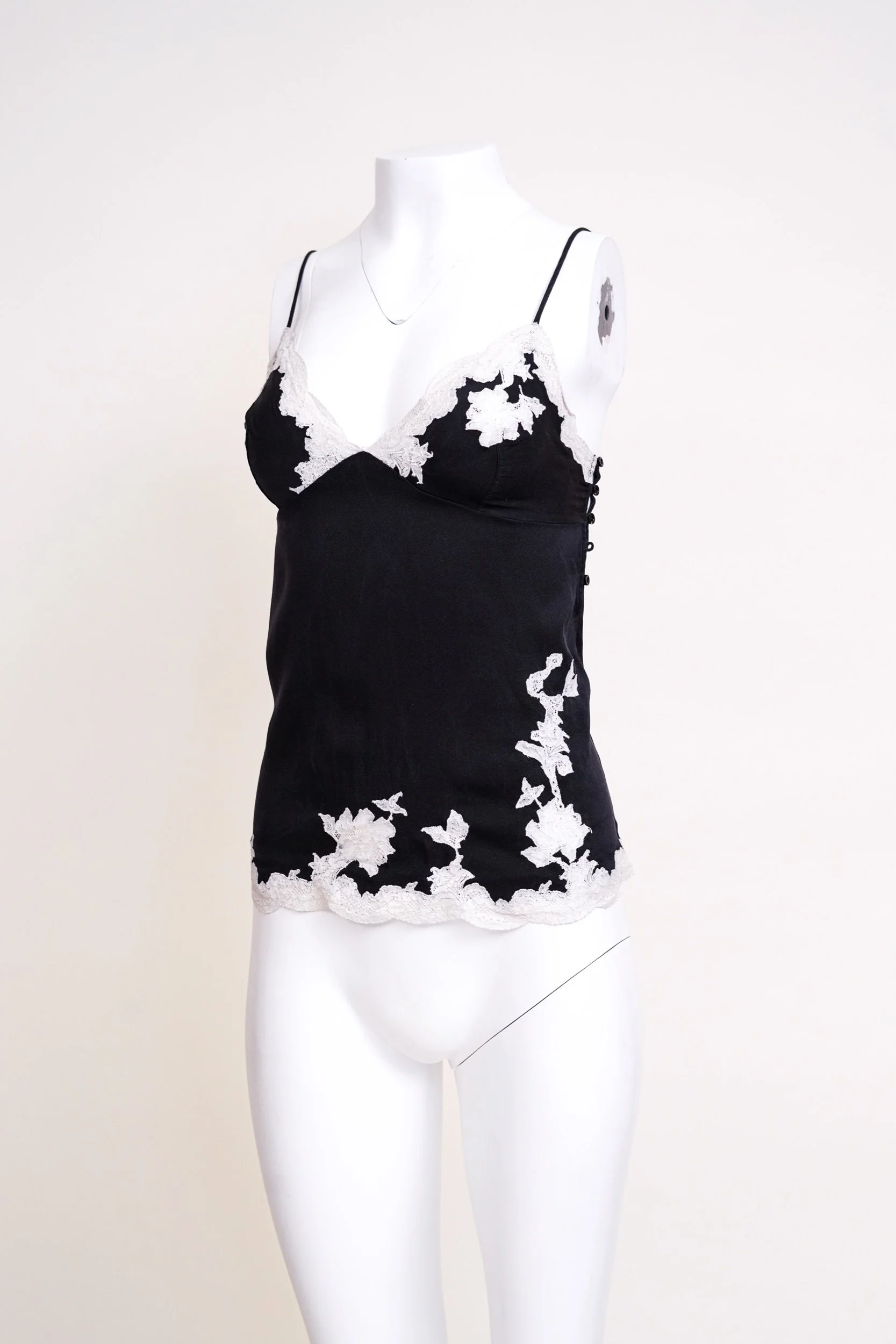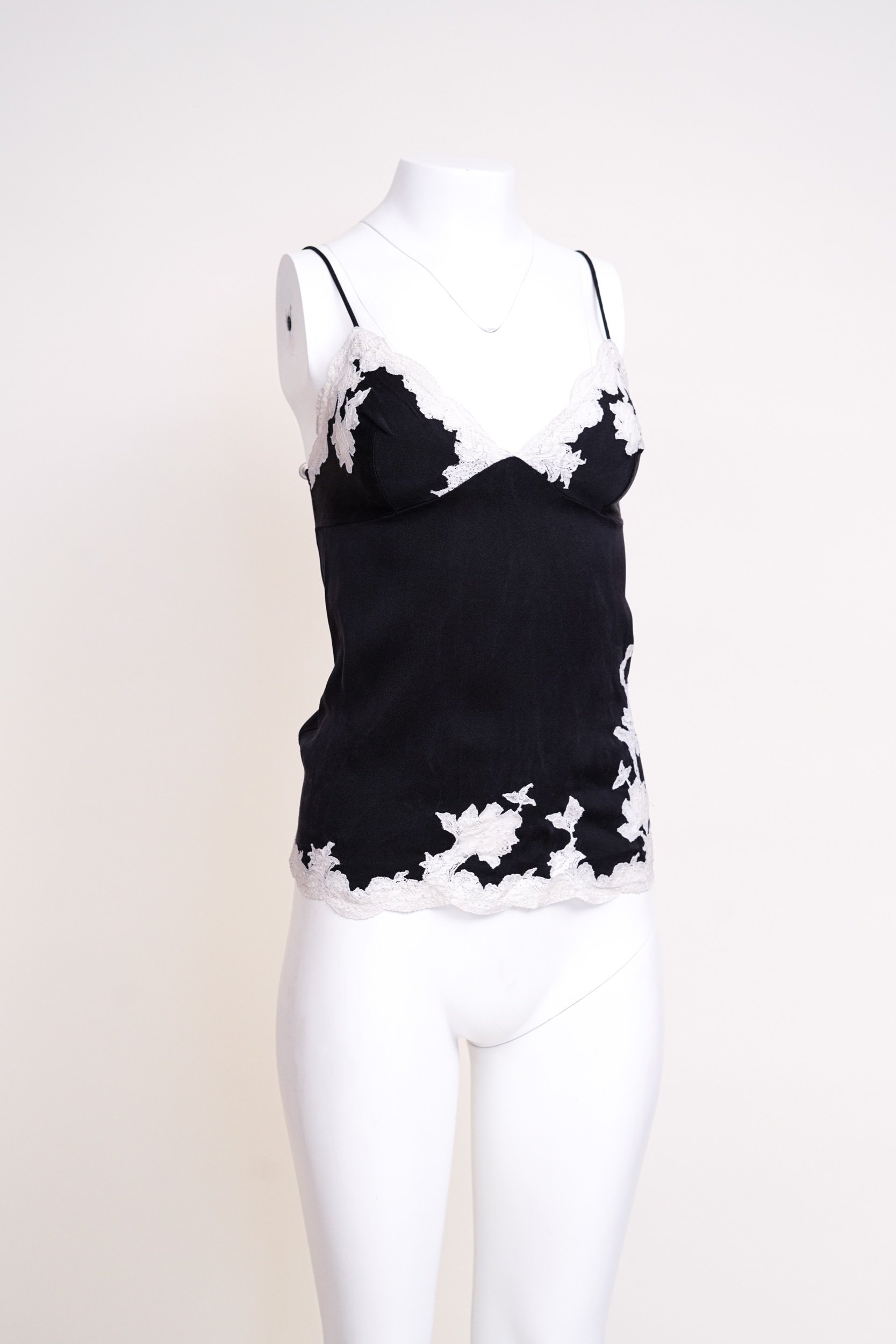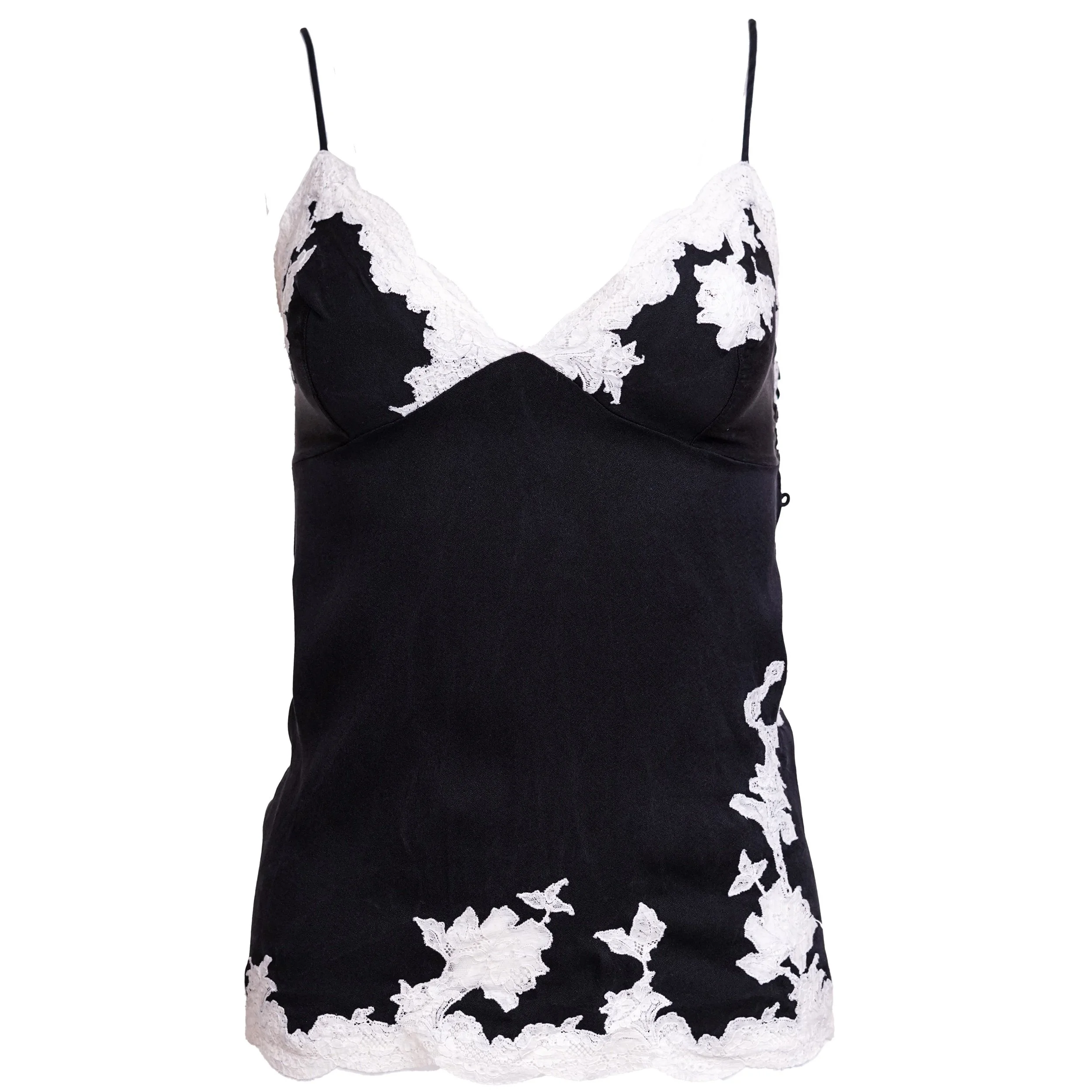 An iconic piece from John Galliano’s Fall/Winter 1998 collection for Christian Dior, this black silk camisole embodies the designer’s romantic, lingerie-inspired aesthetic that defined his era at the house. Delicate ivory lace appliqué traces the neckline and hem, creating a soft contrast against the fluid black silk base, while the fine spaghetti straps enhance its effortlessly sensual silhouette.