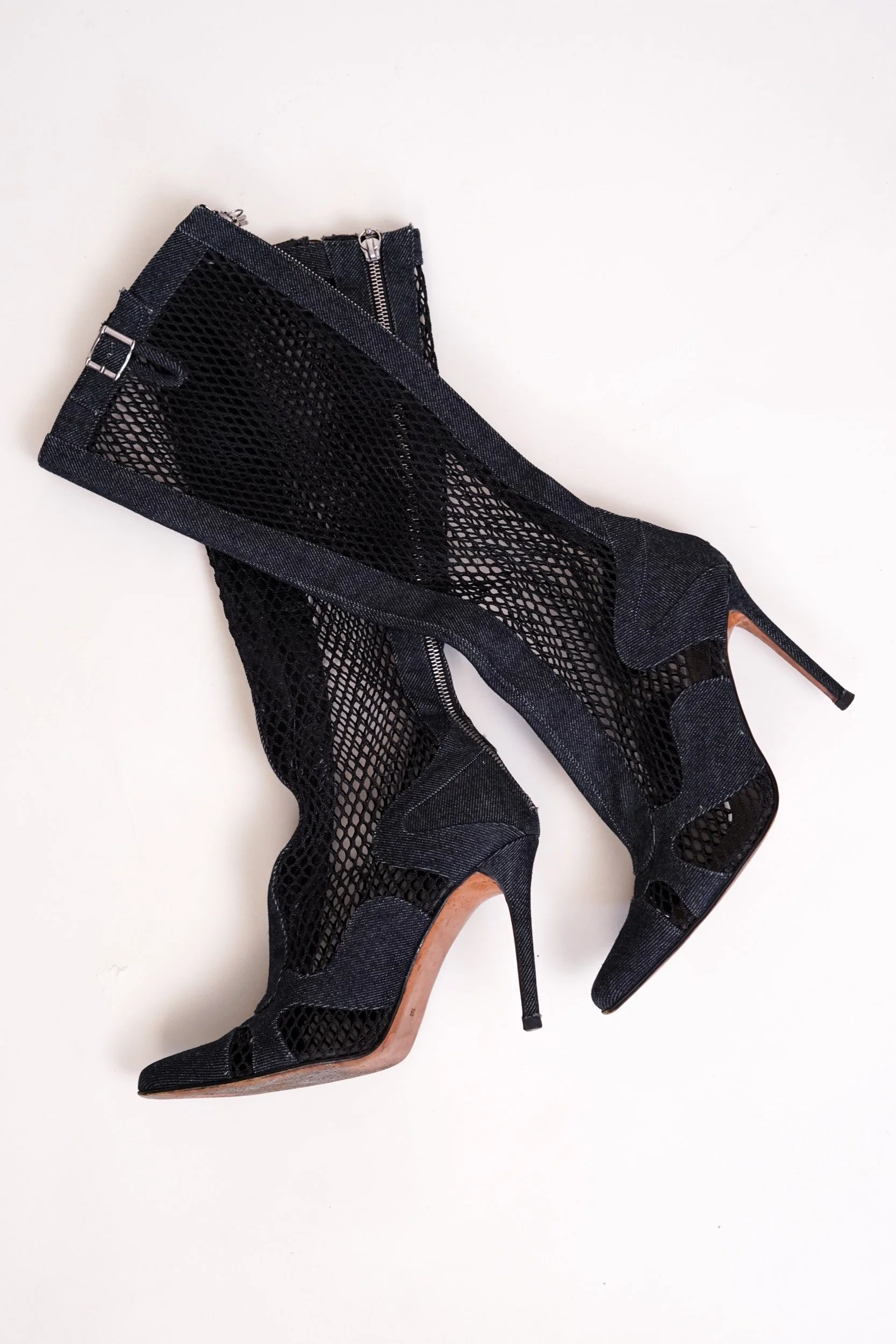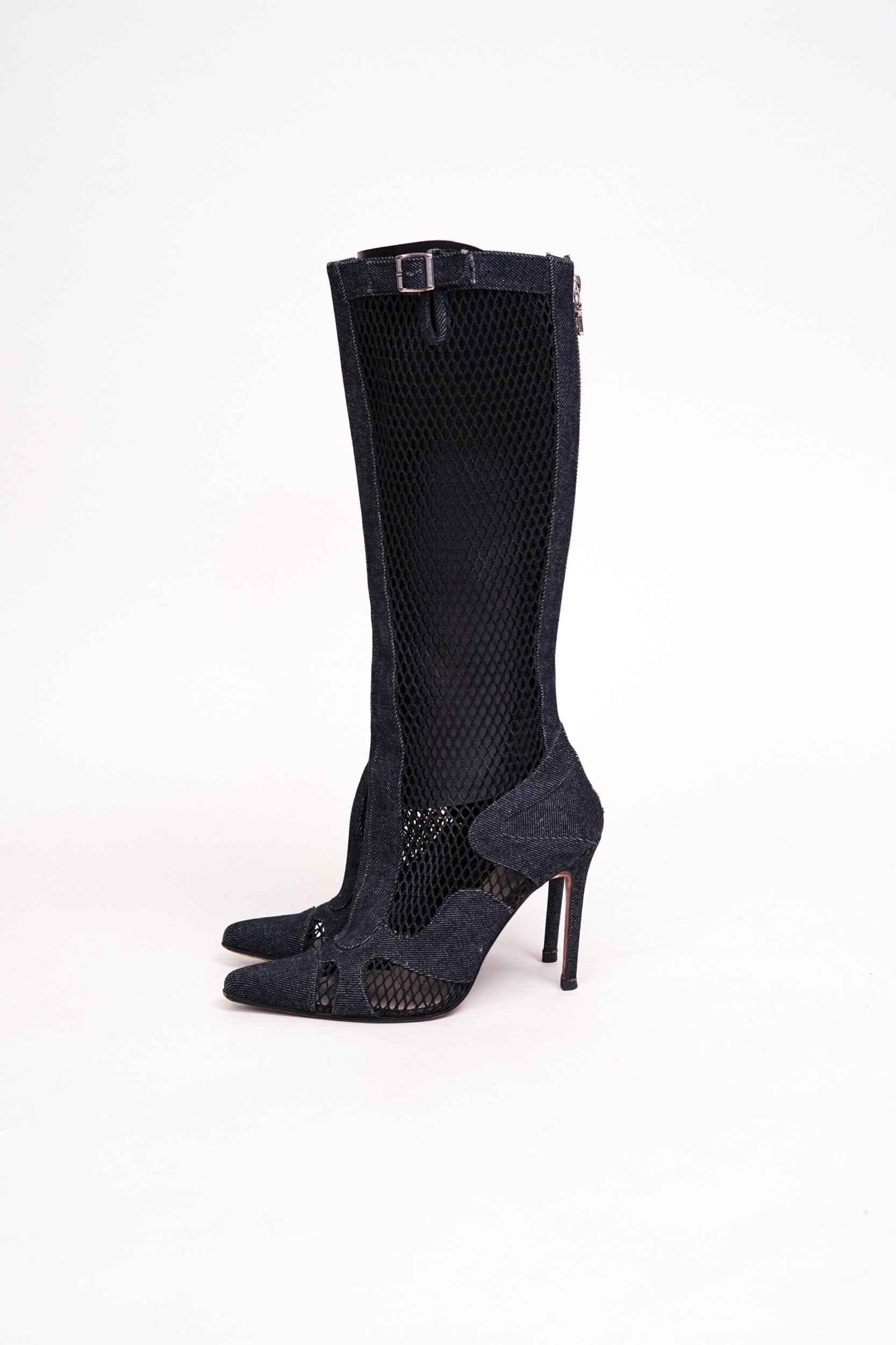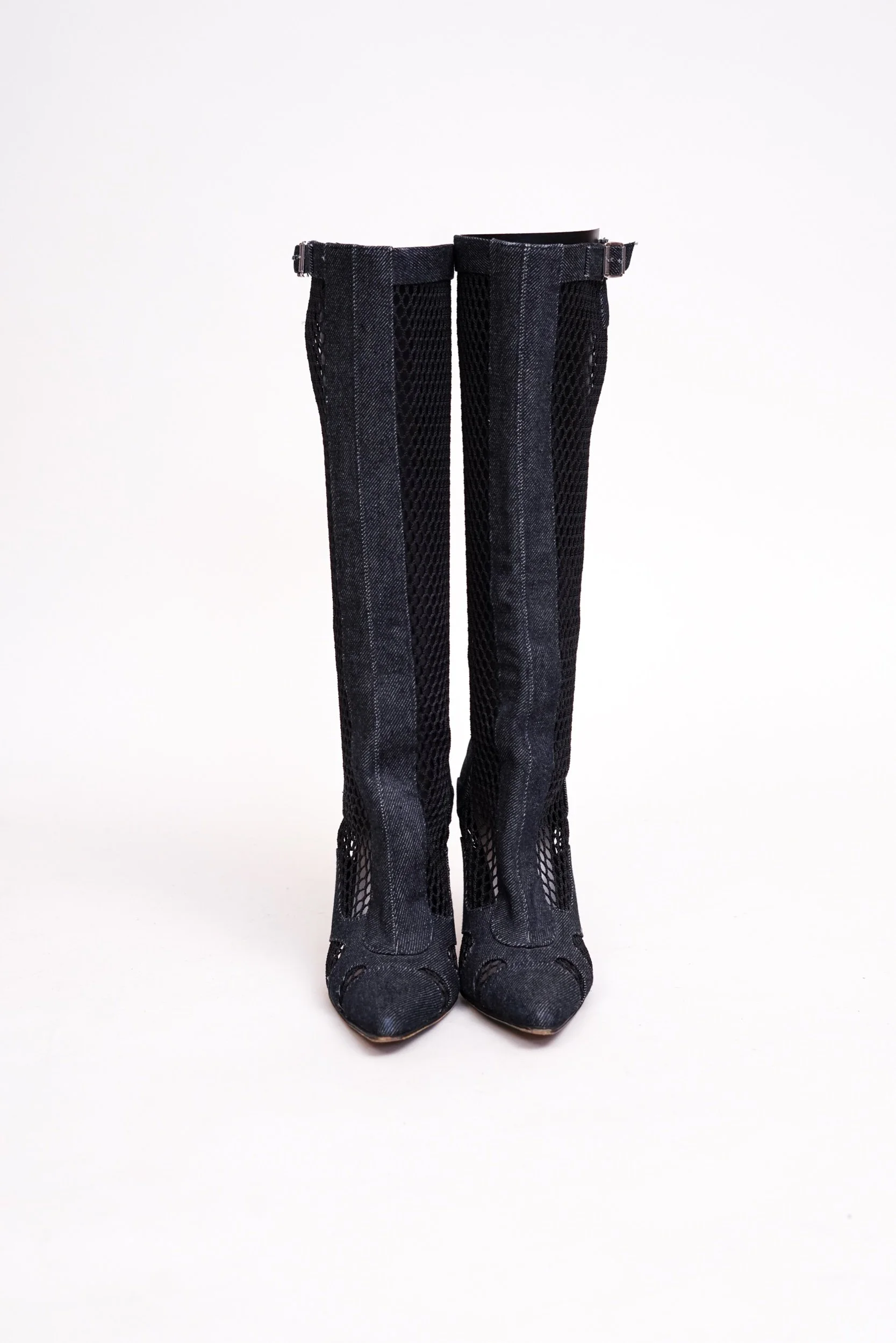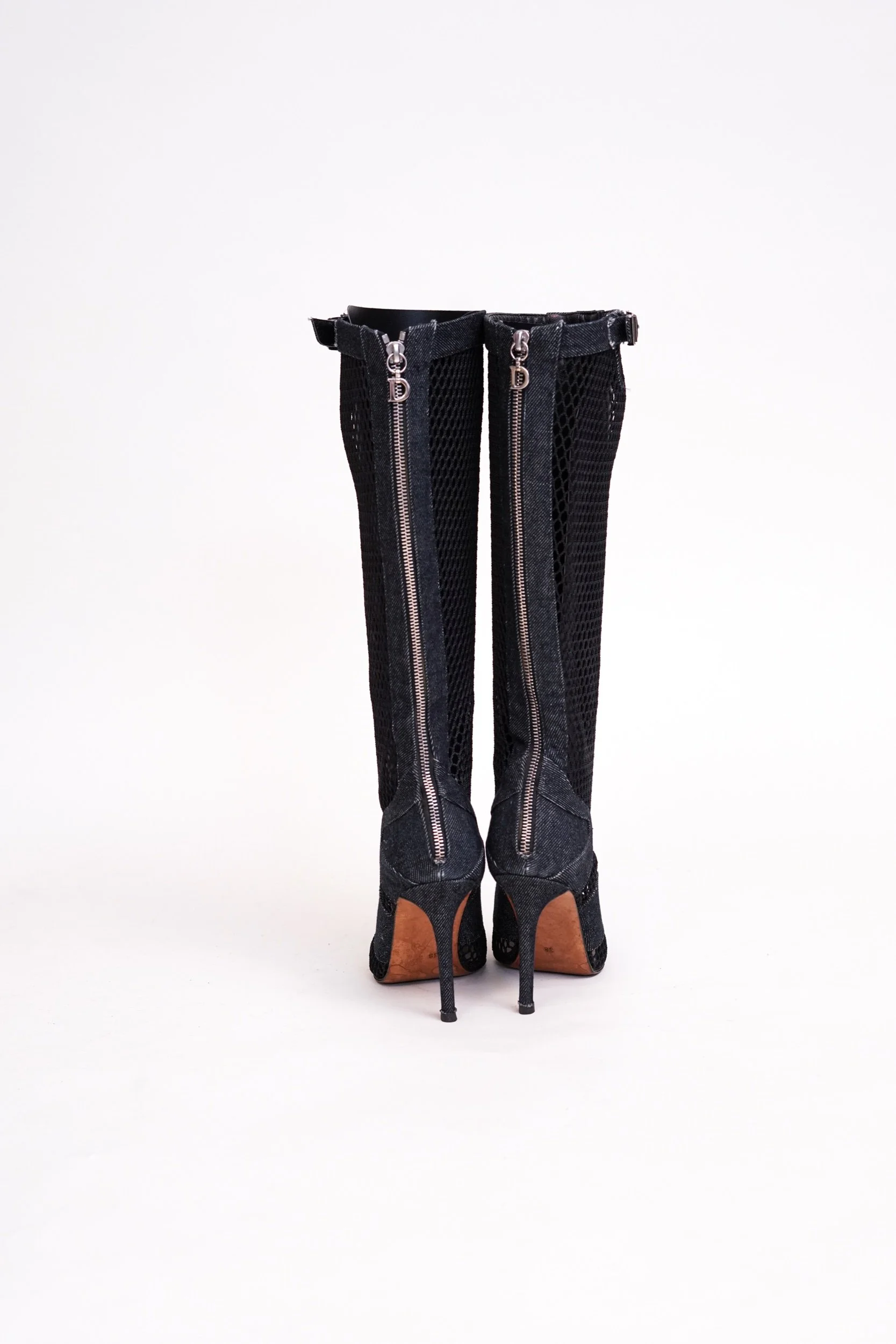 Christian Dior Black Fishnet Knee-High Boots with Denim Accents – Size 38