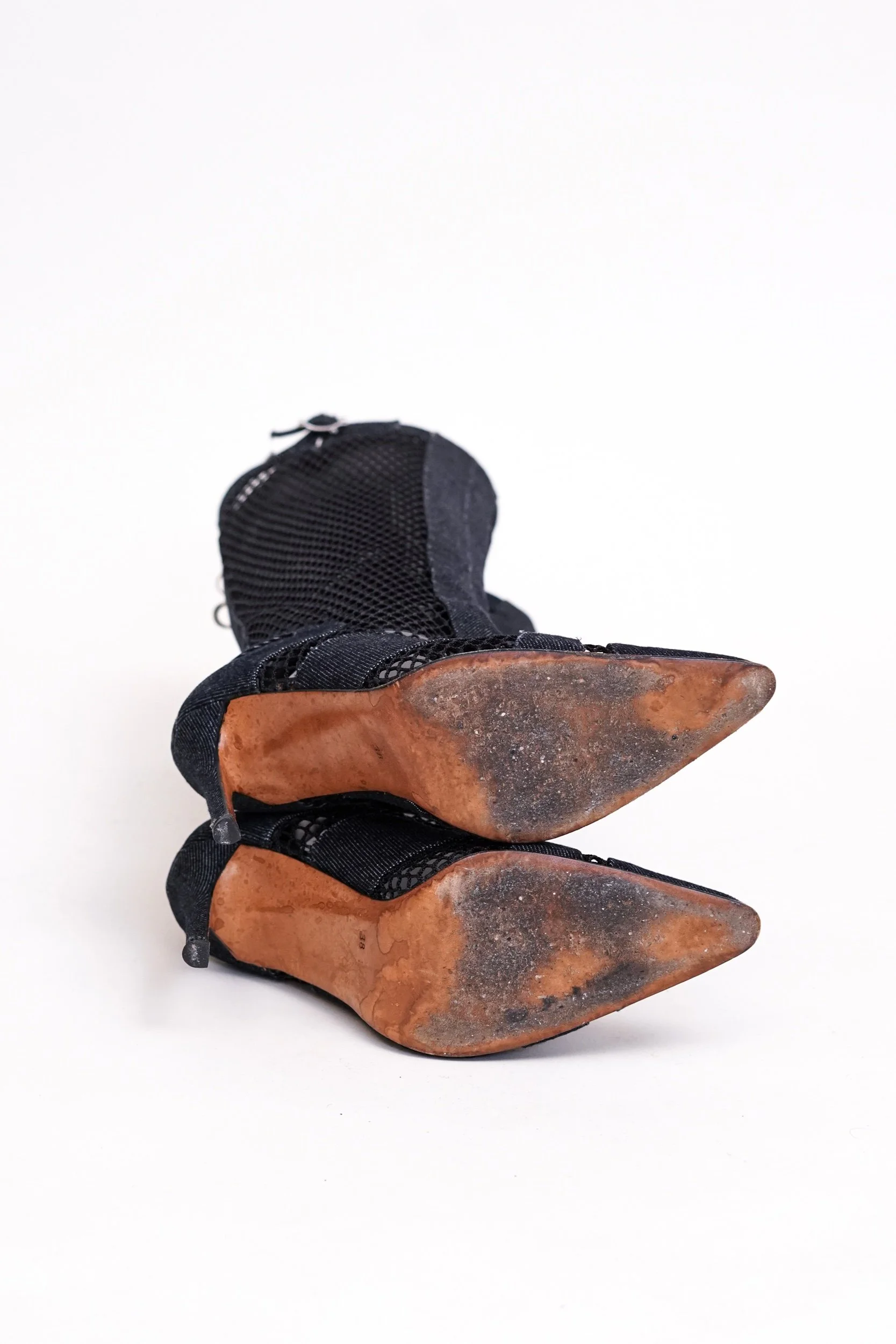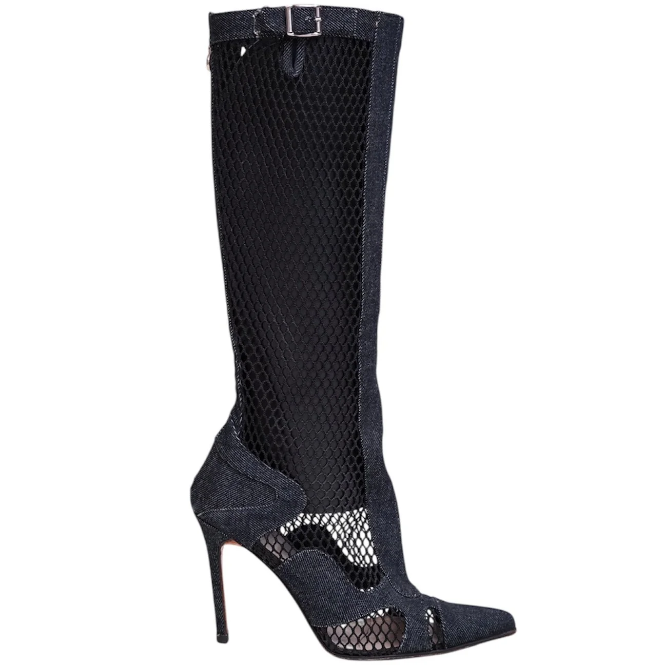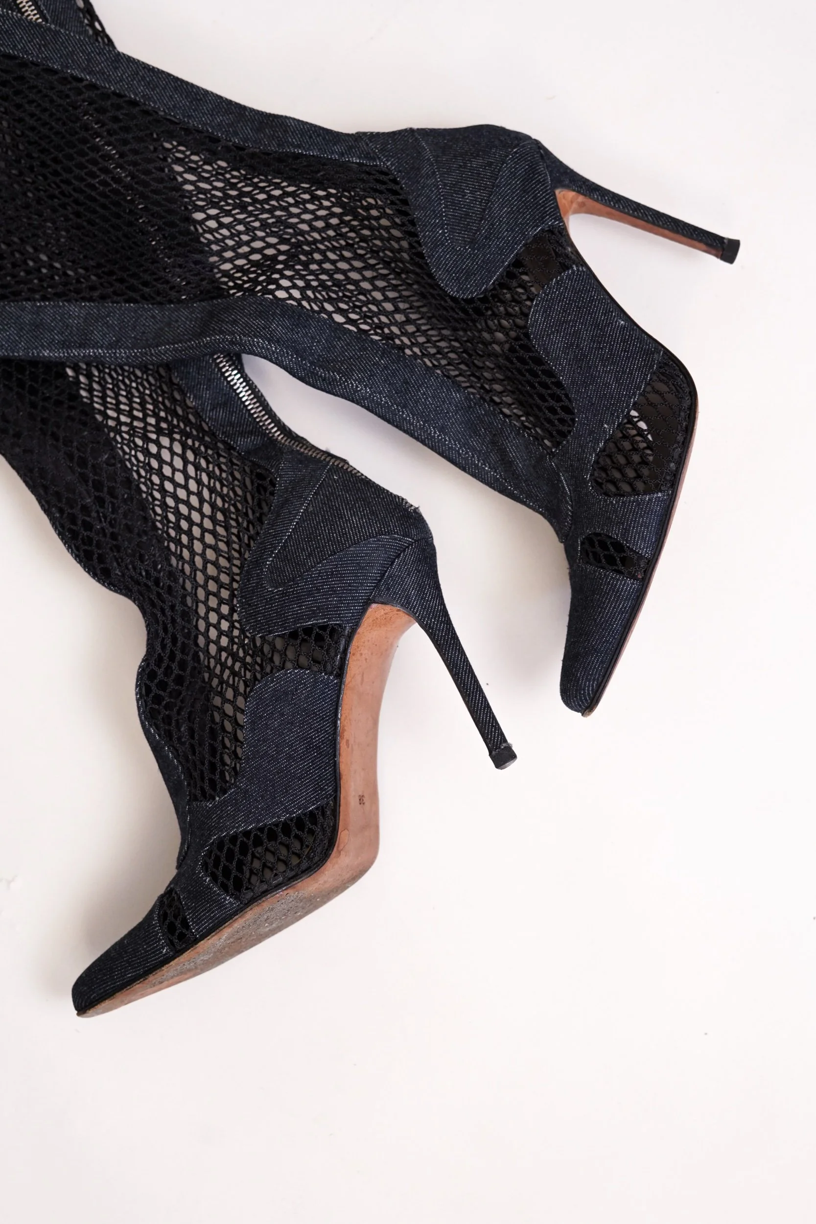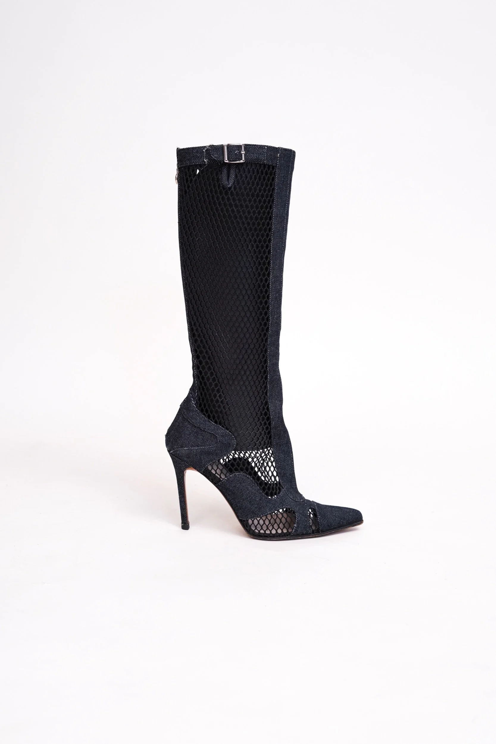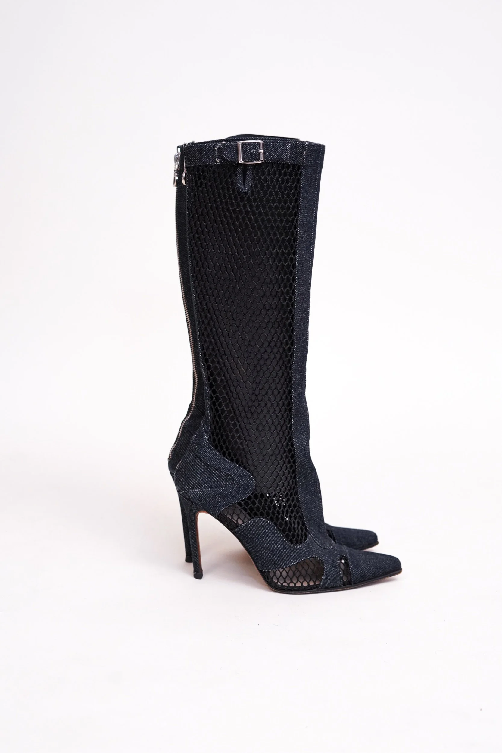 Christian Dior Black Fishnet Knee-High Boots with Denim Accents – Size 38