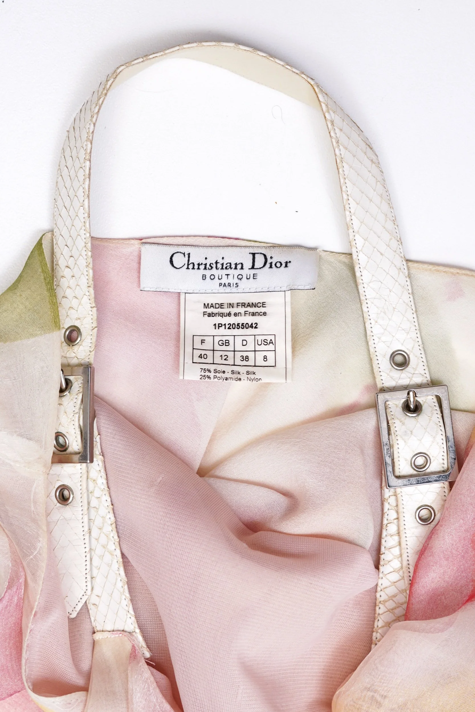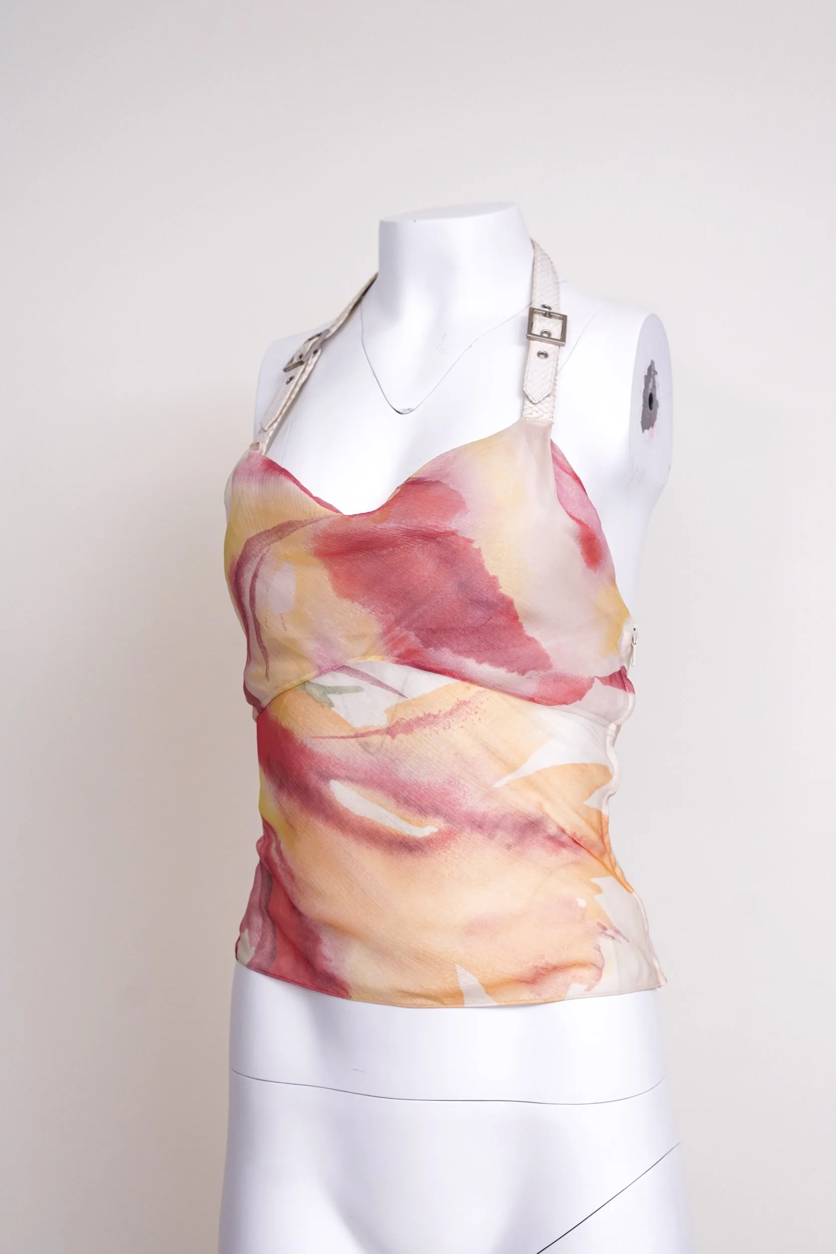 From the Spring/Summer 2001 collection, this delicate silk chiffon halter top by John Galliano for Christian Dior captures a dreamy, bohemian elegance. Designed in soft pink and white tie-dye, it features a draped cowl neckline and a striking snakeskin-accent halter strap with a silver buckle detail, adding an edgy contrast to the fluid silhouette.