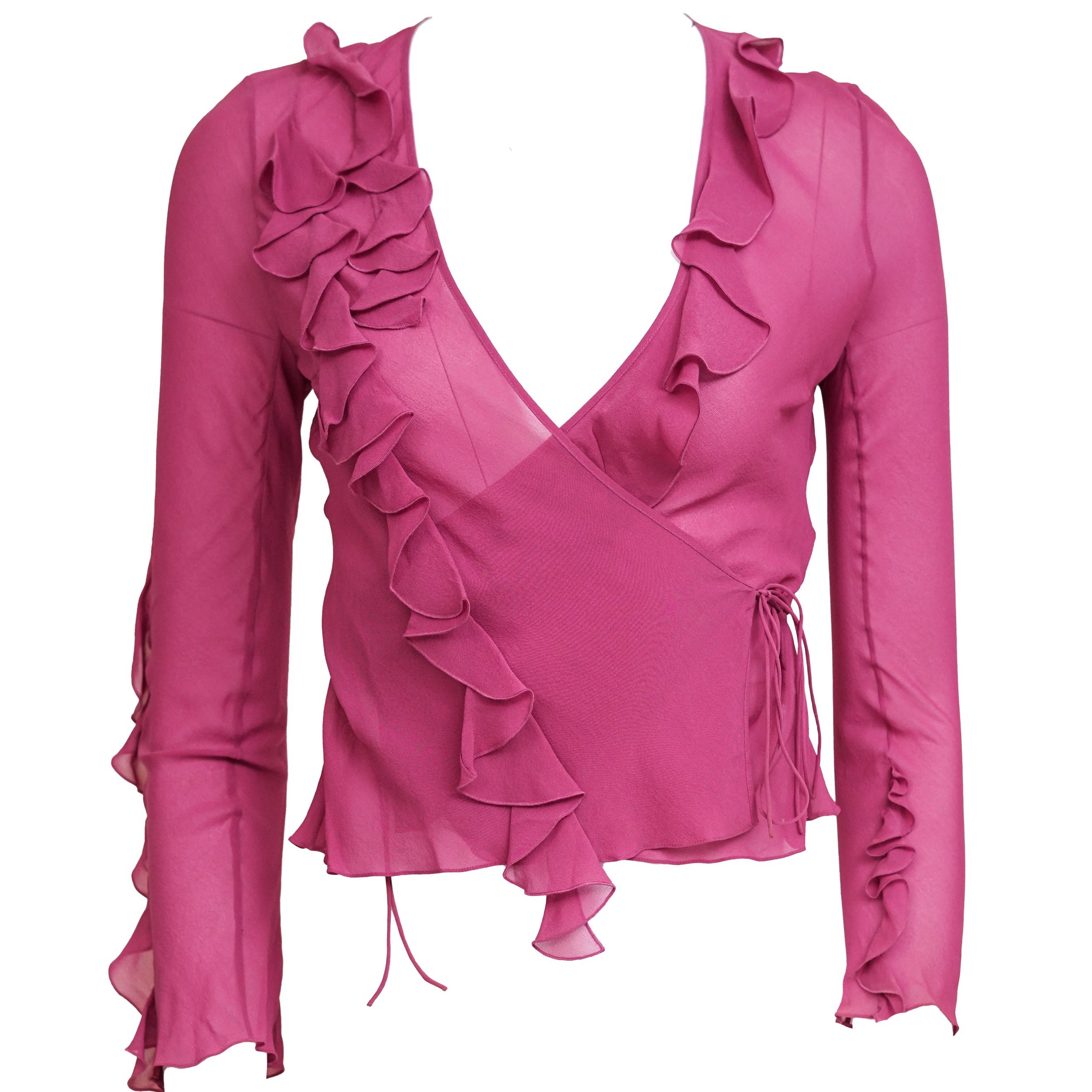 A romantic and feminine piece from Christian Dior, this vibrant pink silk wrap top showcases the house’s signature elegance with a playful, flirty edge. Crafted from 100% silk, the design features a flattering wrap silhouette with cascading ruffle trim along the neckline and bodice, adding soft movement and dimension. The sheer long sleeves and lightweight construction enhance its airy feel, while the rich pink hue makes it a standout statement piece perfect for both day and evening styling.