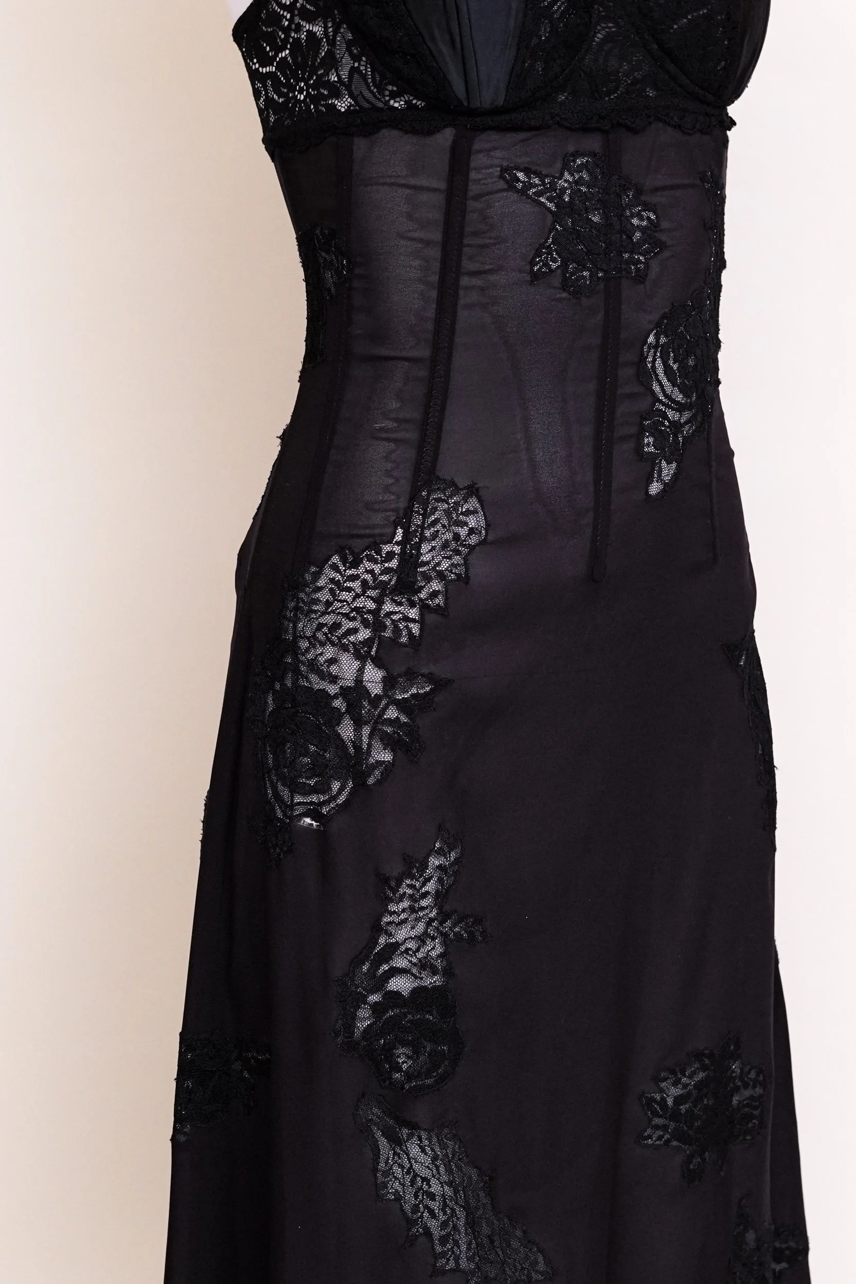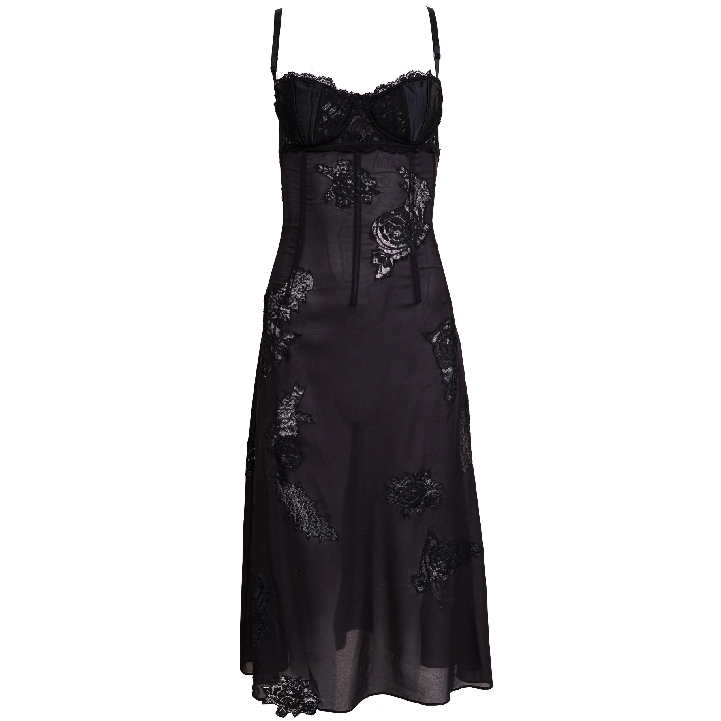 A seductive and timeless piece from Dolce & Gabbana’s 2002 collection, this black slip dress embodies the brand’s signature blend of romance and sensuality. Crafted from sheer, lightweight fabric, the design features a structured corset-style bodice with delicate lace cups and subtle boning that enhances the silhouette. The softly flowing skirt is adorned with intricate lace appliqué, adding depth and texture while maintaining an effortlessly elegant drape.