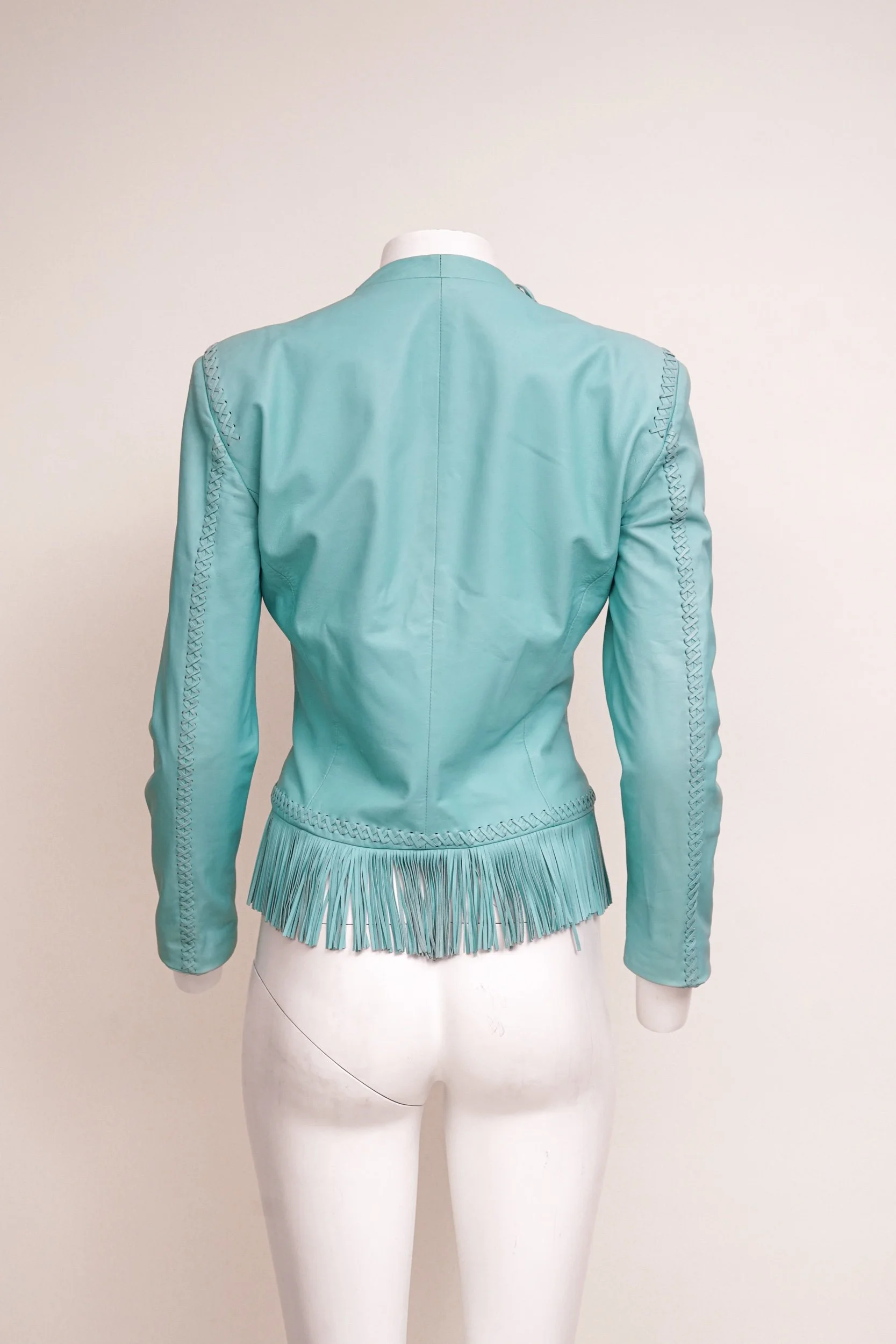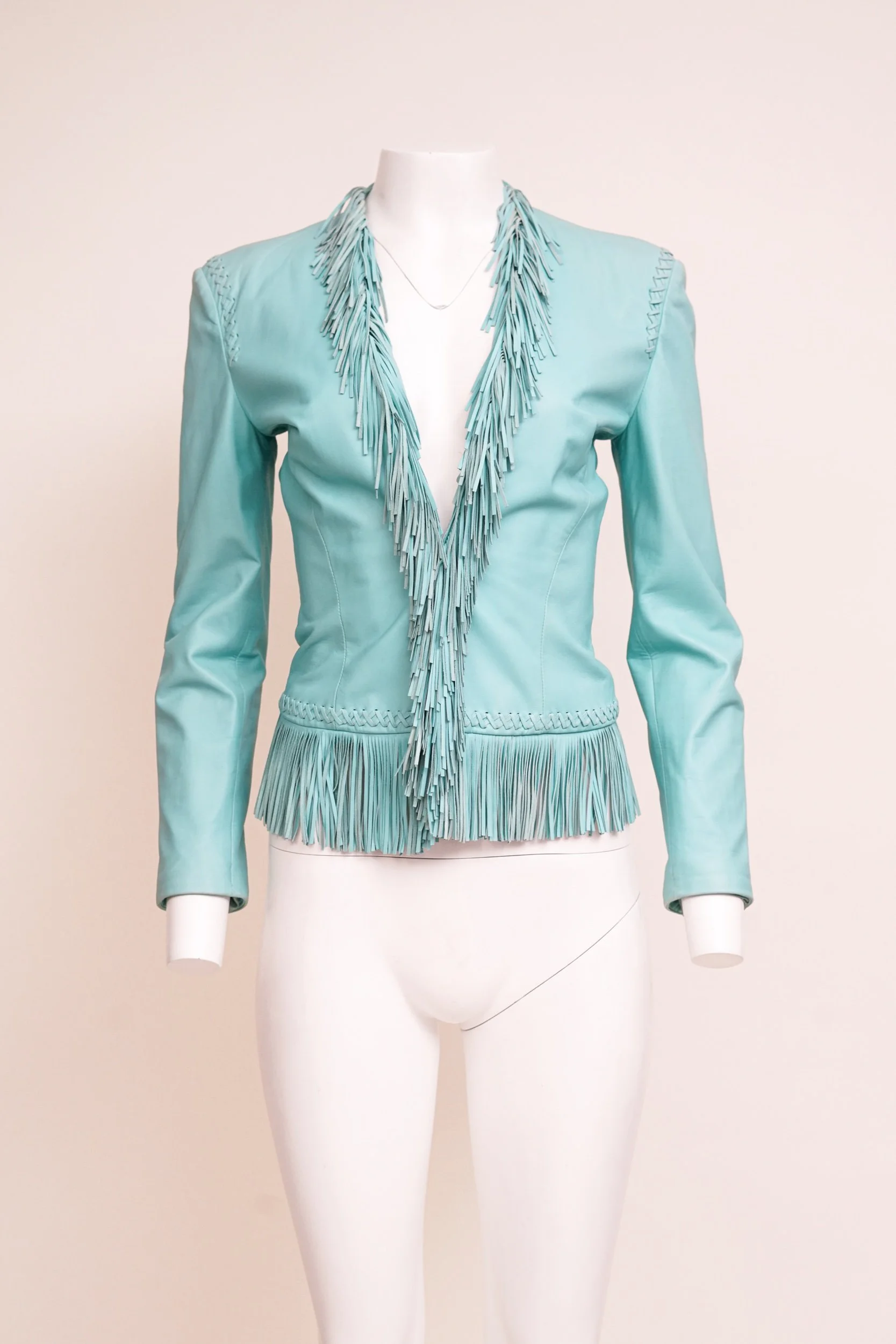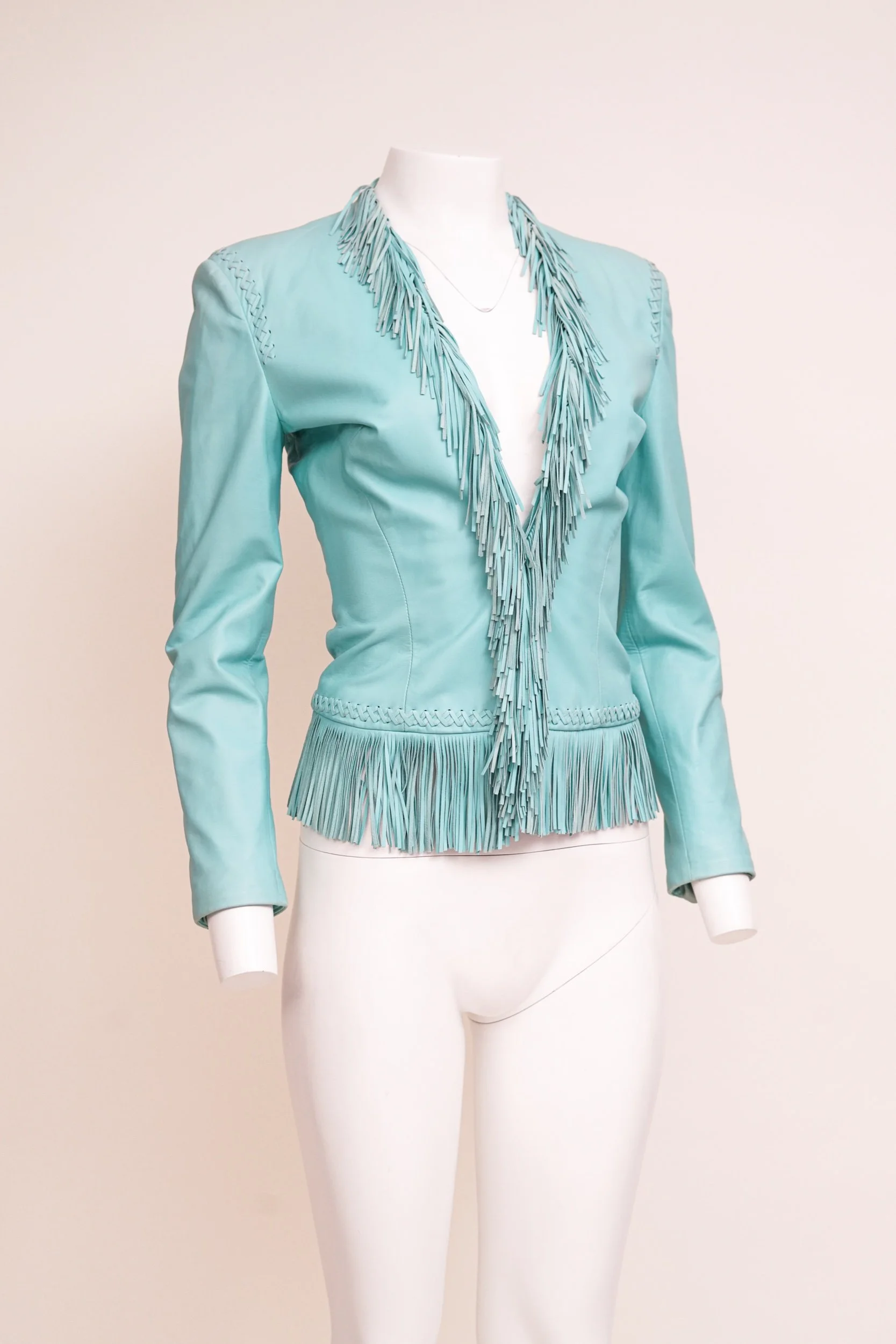 Blue leather jacket with full fringe detailing