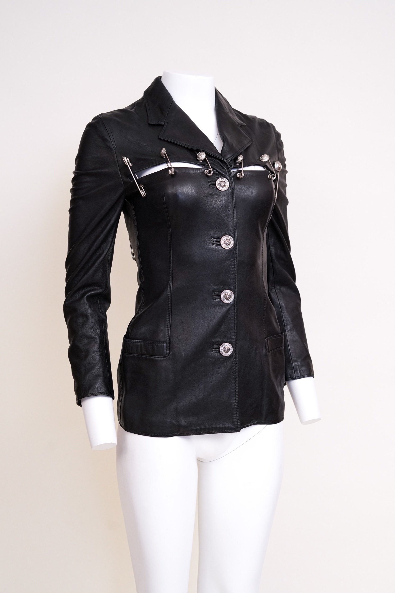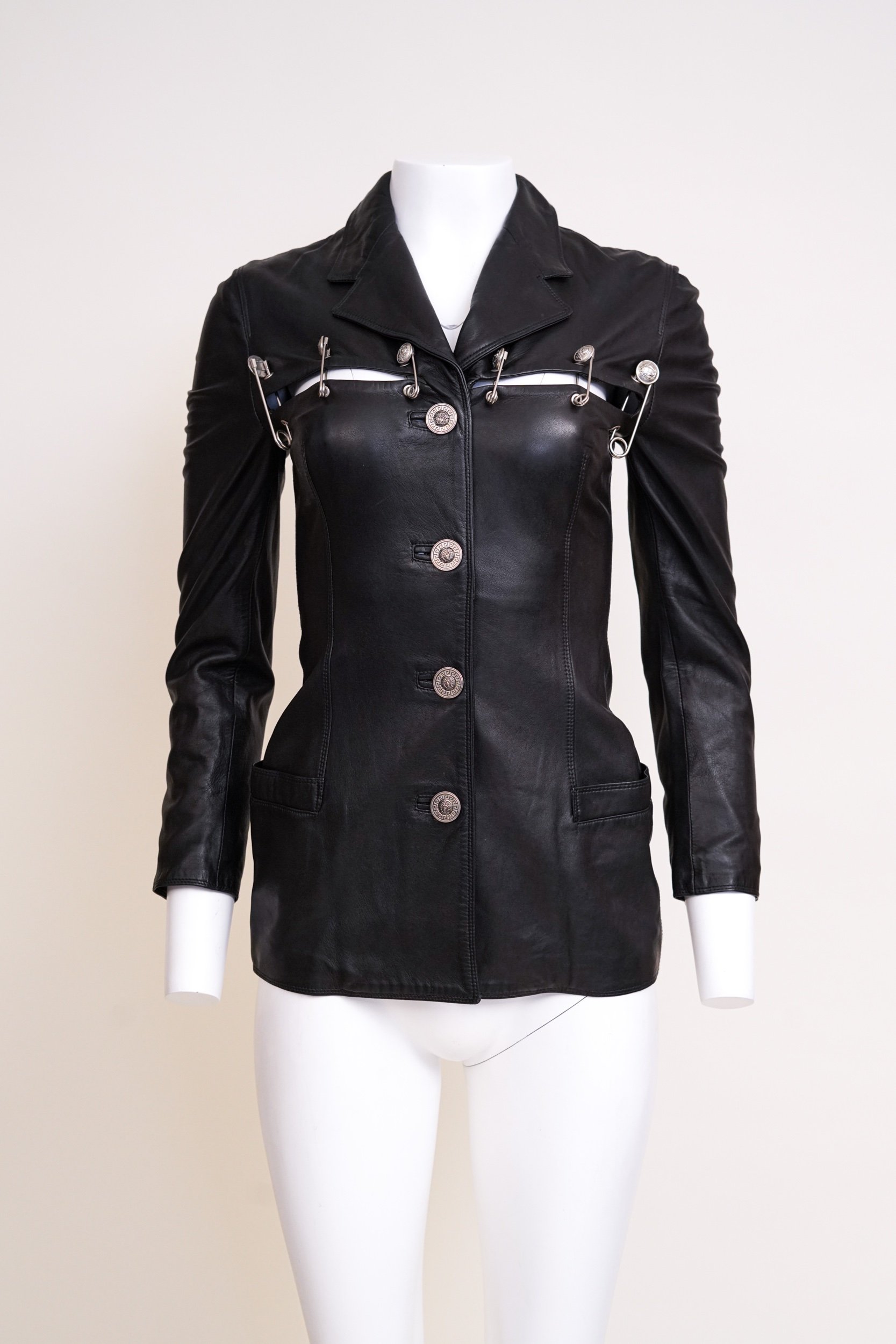 Crafted in a structured silhouette, the jacket features signature cutout accents secured with Versace’s emblematic safety pin hardware—an instantly recognizable motif from this groundbreaking collection. The sharp pointed collar and tailored fit enhance its strong, commanding presence, while subtle Medusa insignia detailing reinforces the house’s iconic identity.