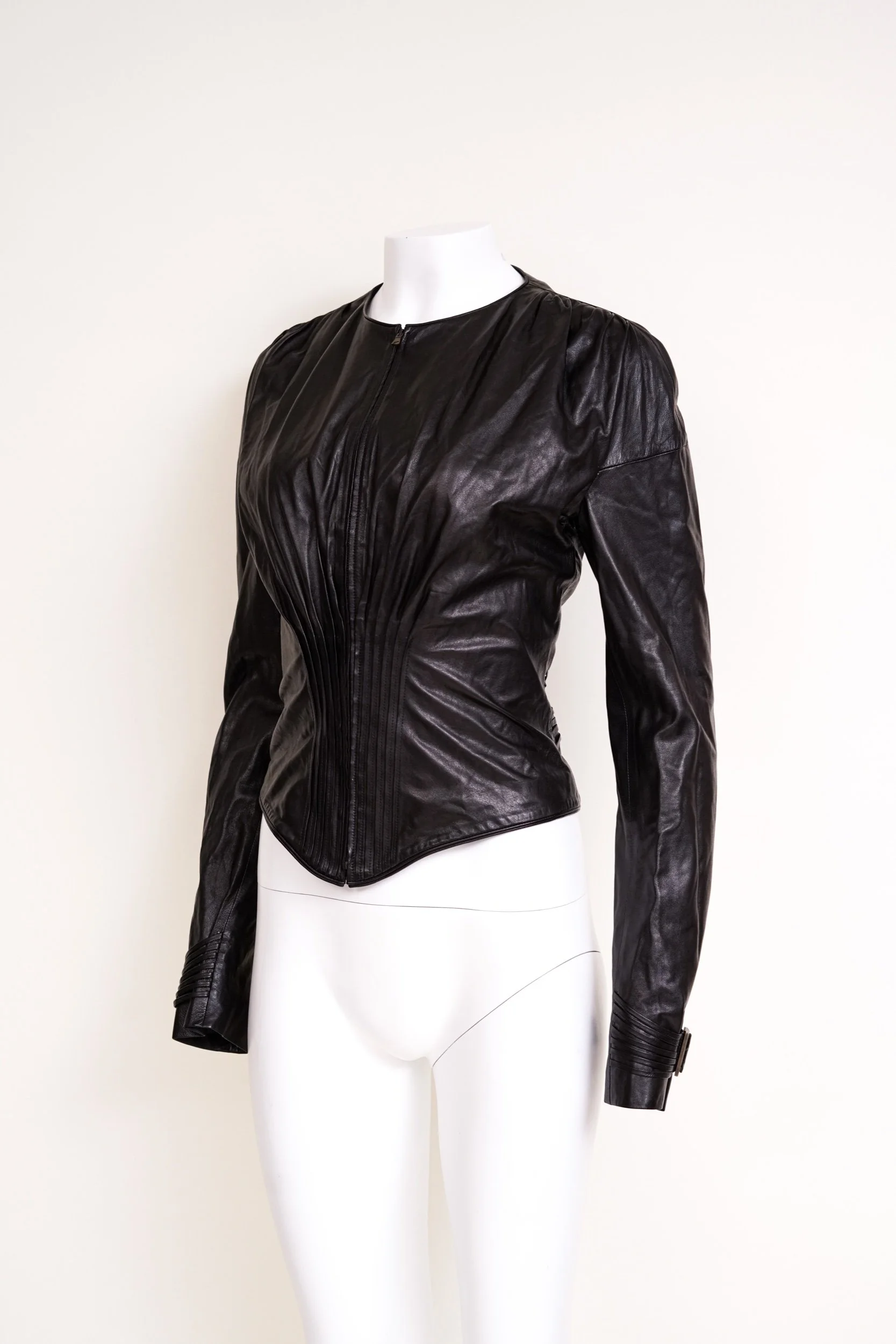 An iconic archival runway piece from Gucci by Tom Ford’s legendary Fall/Winter 2003 collection, this black leather corset jacket is a masterclass in sculptural tailoring and sensual power dressing. Designed with dramatic contoured ruching, a sharply cinched waist, and an elongated corset-style bodice, the silhouette creates an ultra-feminine, hourglass shape synonymous with Ford’s Gucci era. Crafted in supple black leather with a sleek front zip closure and elongated fitted sleeves, this is a museum-level collector’s piece from one of fashion’s most influential runway seasons.