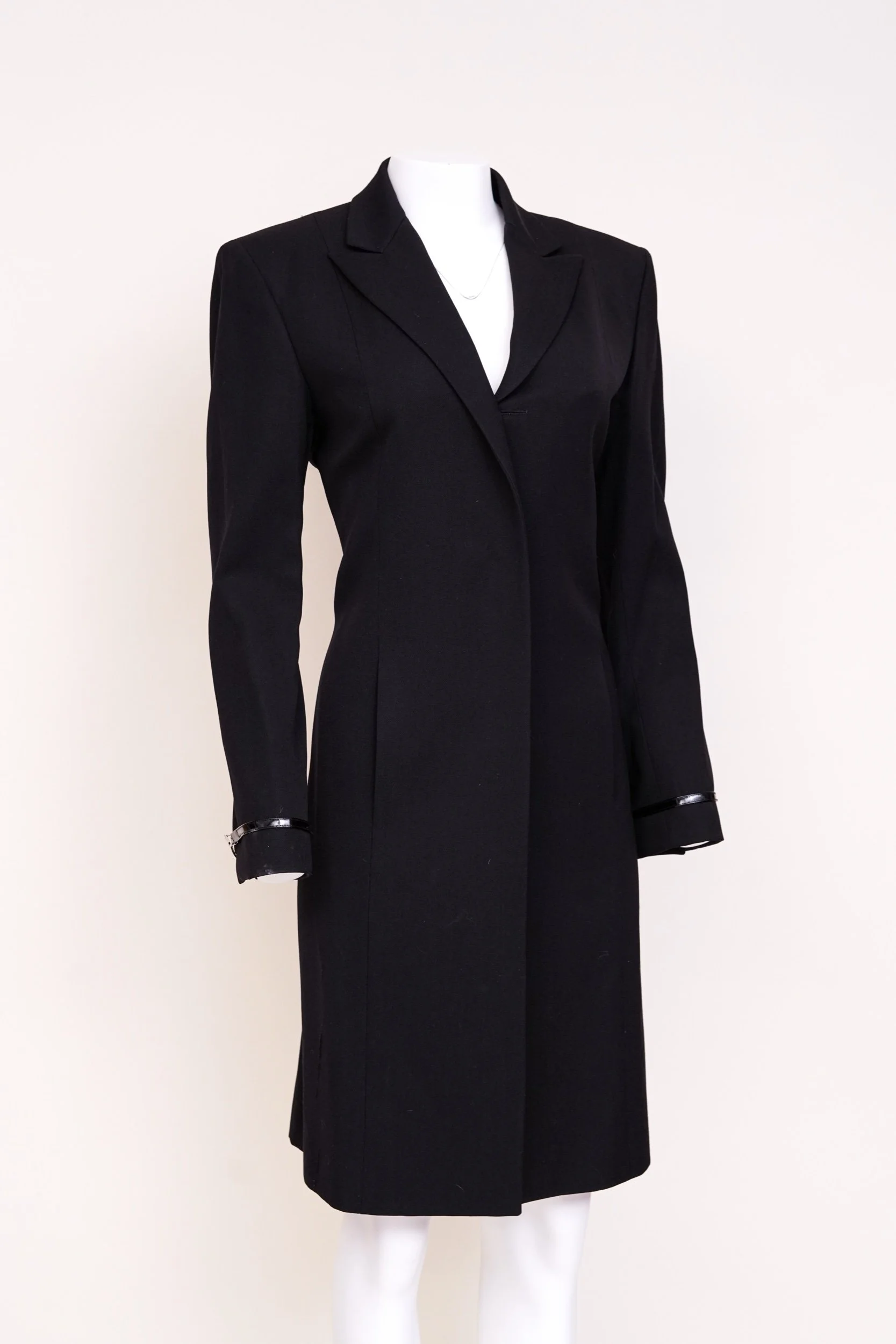 A powerful and highly collectible runway piece from Gucci’s Fall/Winter 1997 collection by Tom Ford, this black wool coat exemplifies the designer’s sharp tailoring and sensual minimalism. Designed with a structured pointed collar and classic button-front closure, the coat is finished with a signature black leather strap accented by a silver-tone “G” buckle—an iconic detail from Tom Ford’s era at Gucci.