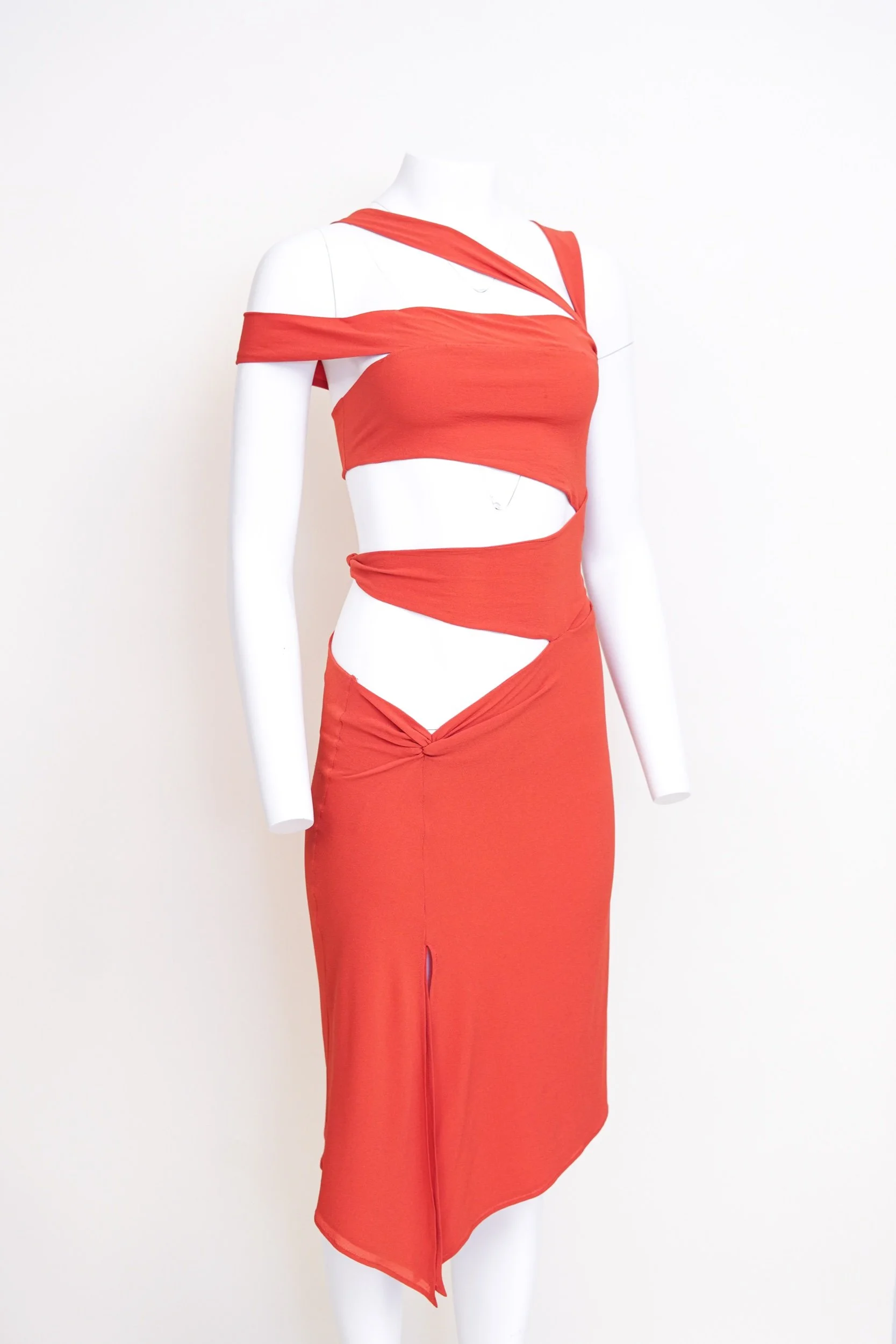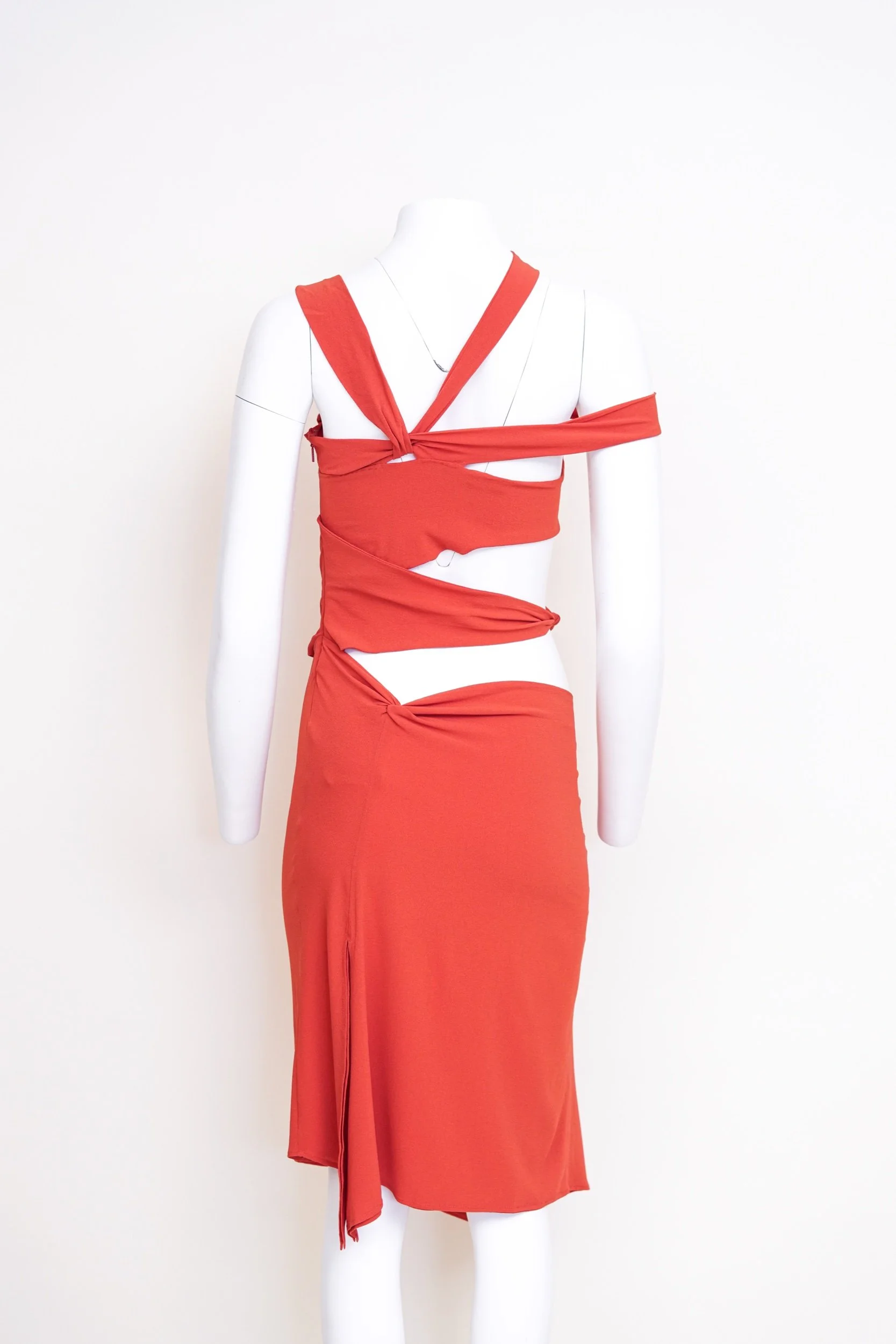 From the Fall/Winter 2003 collection designed by Tom Ford for Gucci, this striking red silk dress captures the sensual, sculptural aesthetic that defined Ford’s iconic era at the house. The design features a bold asymmetrical neckline with delicate shoulder straps, a dramatic midriff cutout, and fluid draping that twists across the bodice to create a dynamic, body-contouring silhouette. The skirt falls into an elegant asymmetric hem, adding movement and effortless allure to the piece.