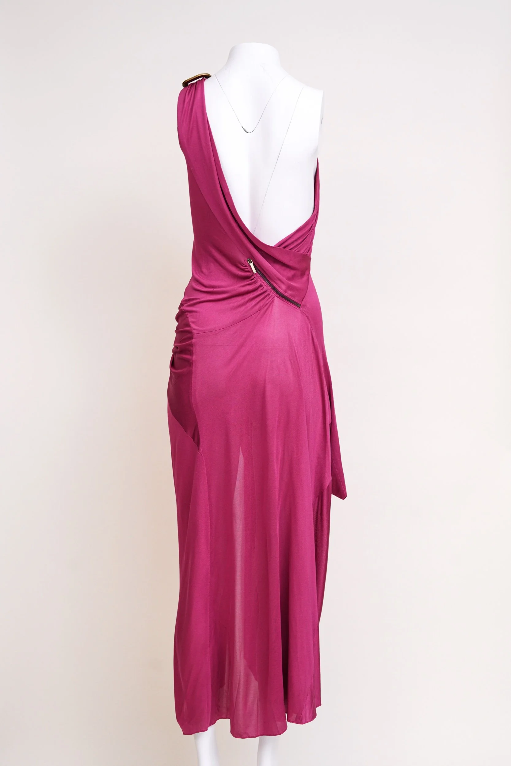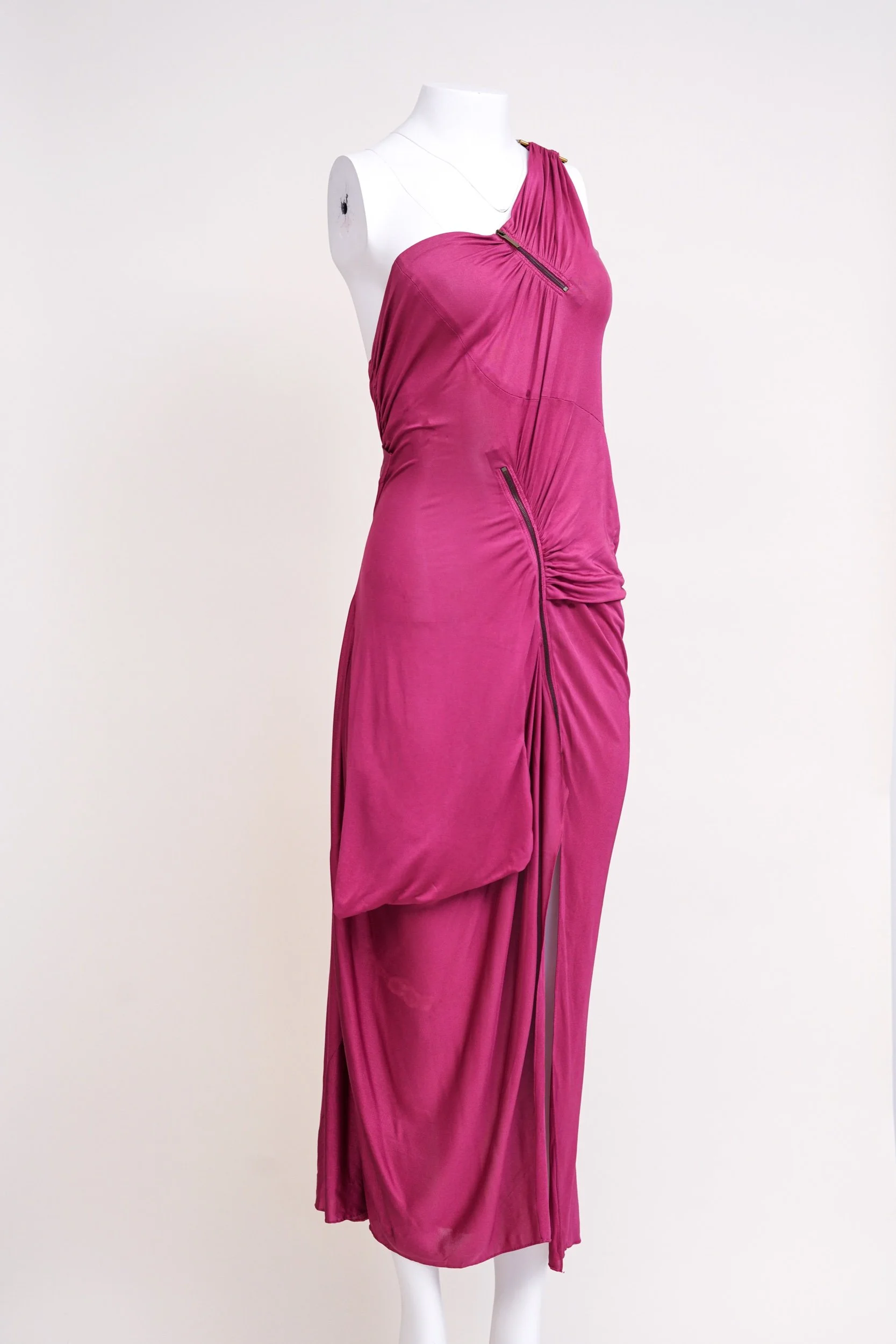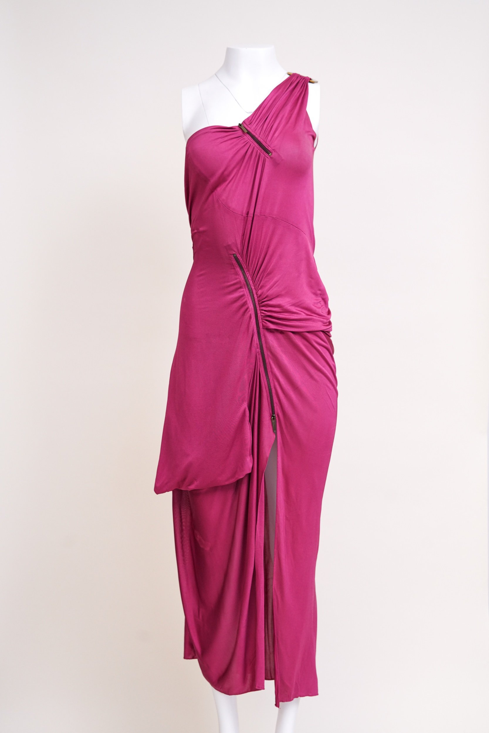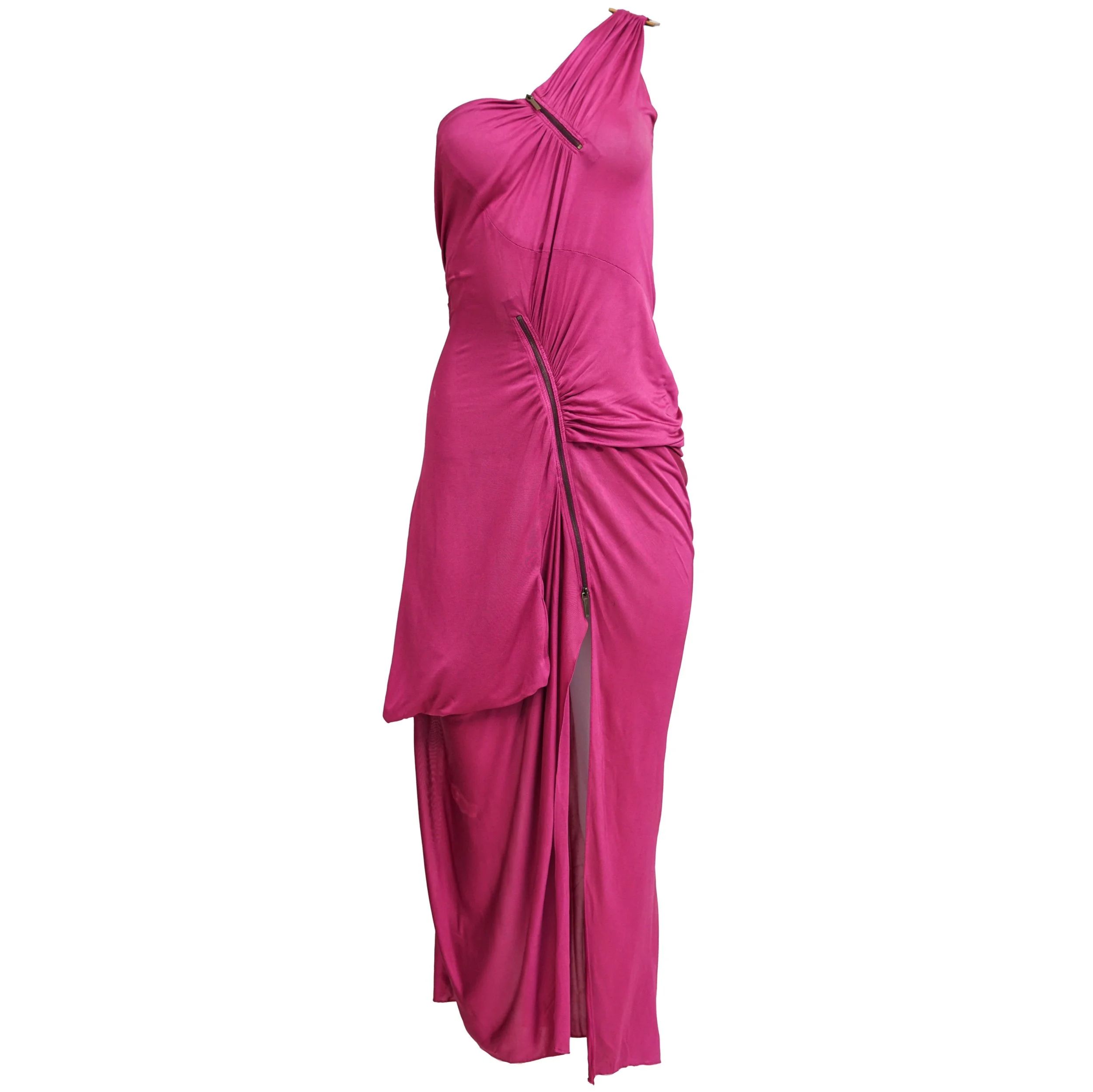 A front zipper detail runs through the draped construction, allowing the slit to be adjusted for a customizable, leg-baring effect that adds movement and sensuality to the piece. The vivid pink tone and artful draping capture the theatrical yet refined aesthetic that defined Galliano’s work for Dior during this period.